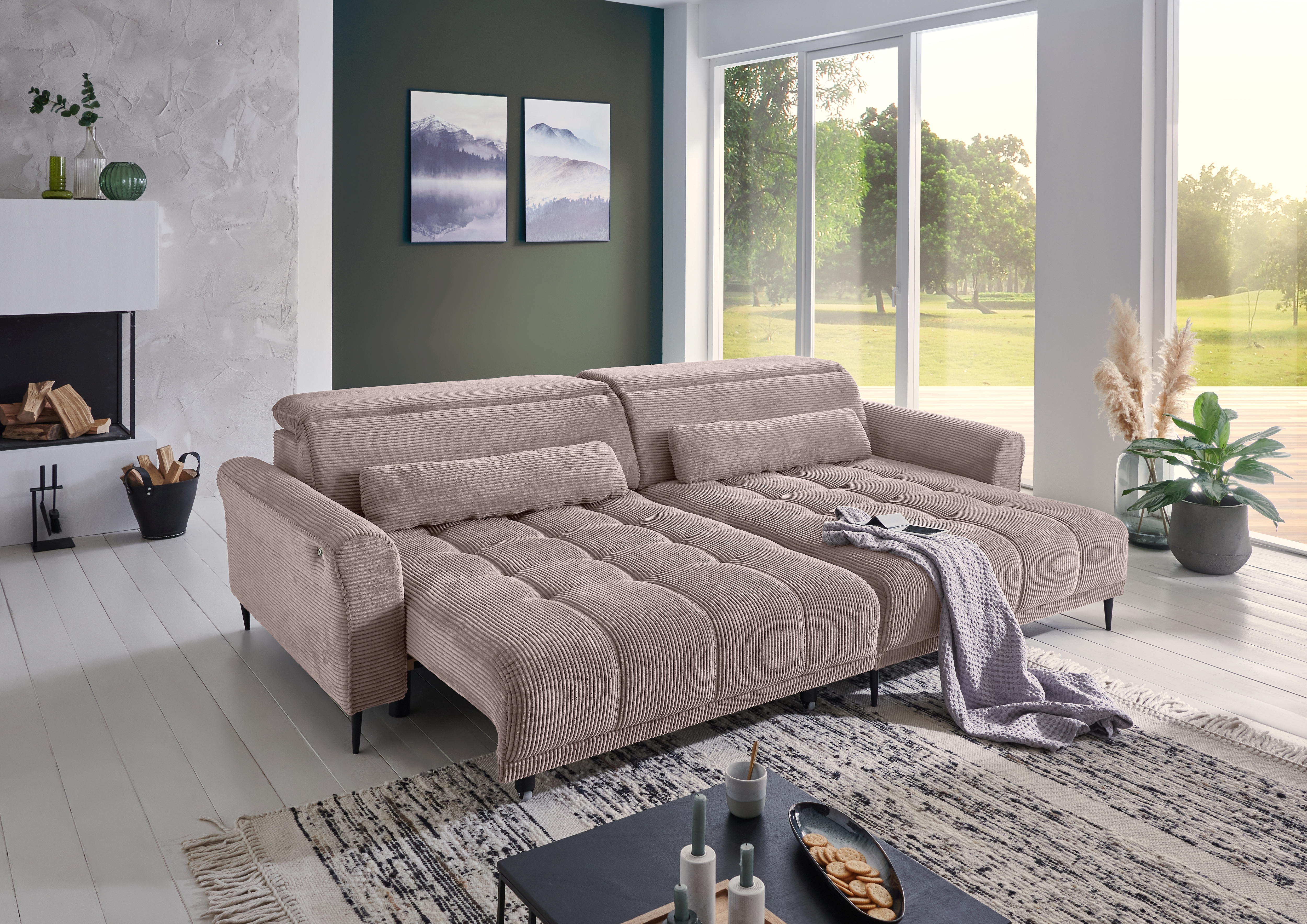 Ausstattung Polster: | Kopfstützen, Ottomane rechts, Sitzvorzug motorisch, inkl. Kissen |