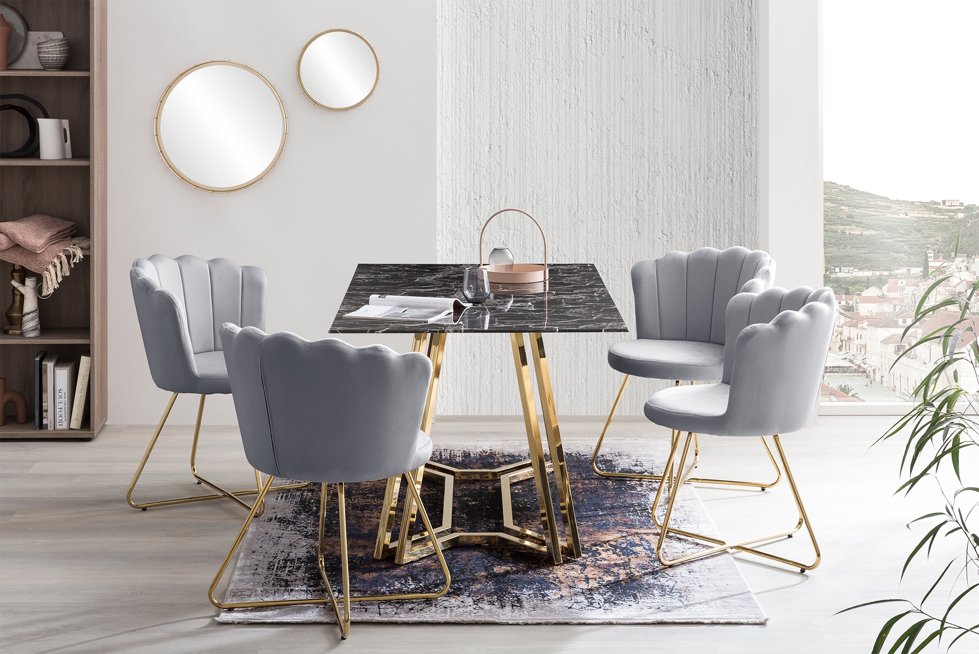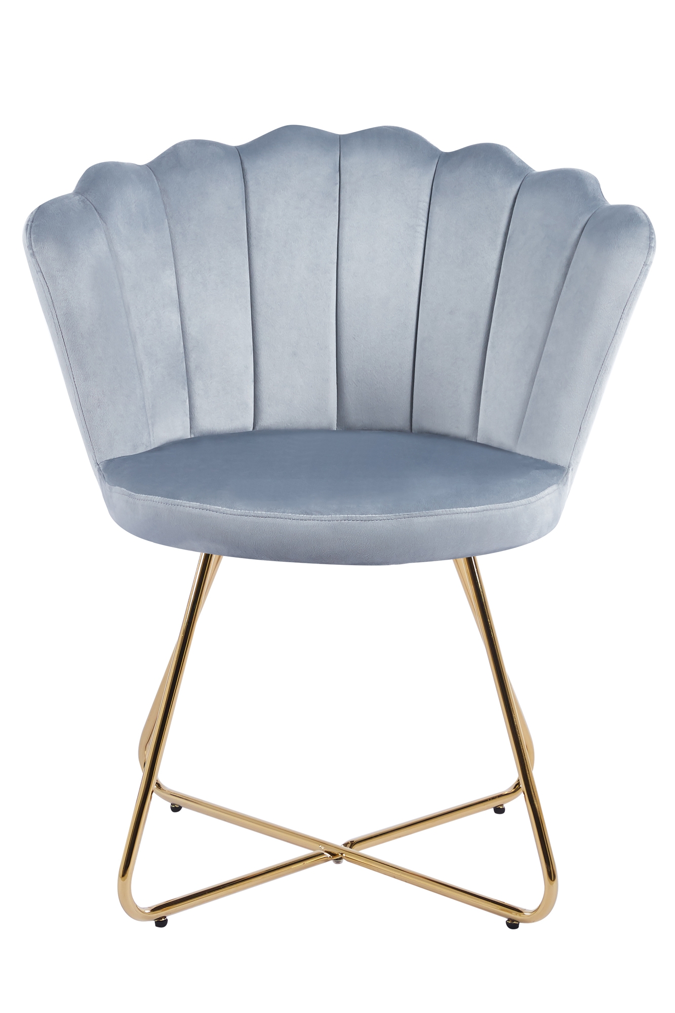 Entfliehen Sie dem Alltag und genießen Sie eine kleine Auszeit. Das moderne Stuhl-Set im Muschel-Design besticht durch seinen Bezug aus Samt und überzeugt mit seinem abgerundeten Sitz- und Rückenbereich. Das überkreuzte Design-Gestell aus vergoldetem Metall gewährleistet nicht nur einen sicheren Stand, sondern bietet auch einen großartigen Kontrast zum Bezug des Stuhls. Durch die Polsterung an Sitz- und Rückenfläche und die stylische Form erleben Sie erstklassigen Sitzkomfort. Die abgerundete Form sorgt für einen weichen Look. Der Stuhl kann im Speisezimmer als Esszimmerstuhl oder zum Beispiel als Sitzgelegenheit am Schminktisch dienen. Egal wo er platziert wird, dieser Muschelstuhl ist ein echter Blickfang.