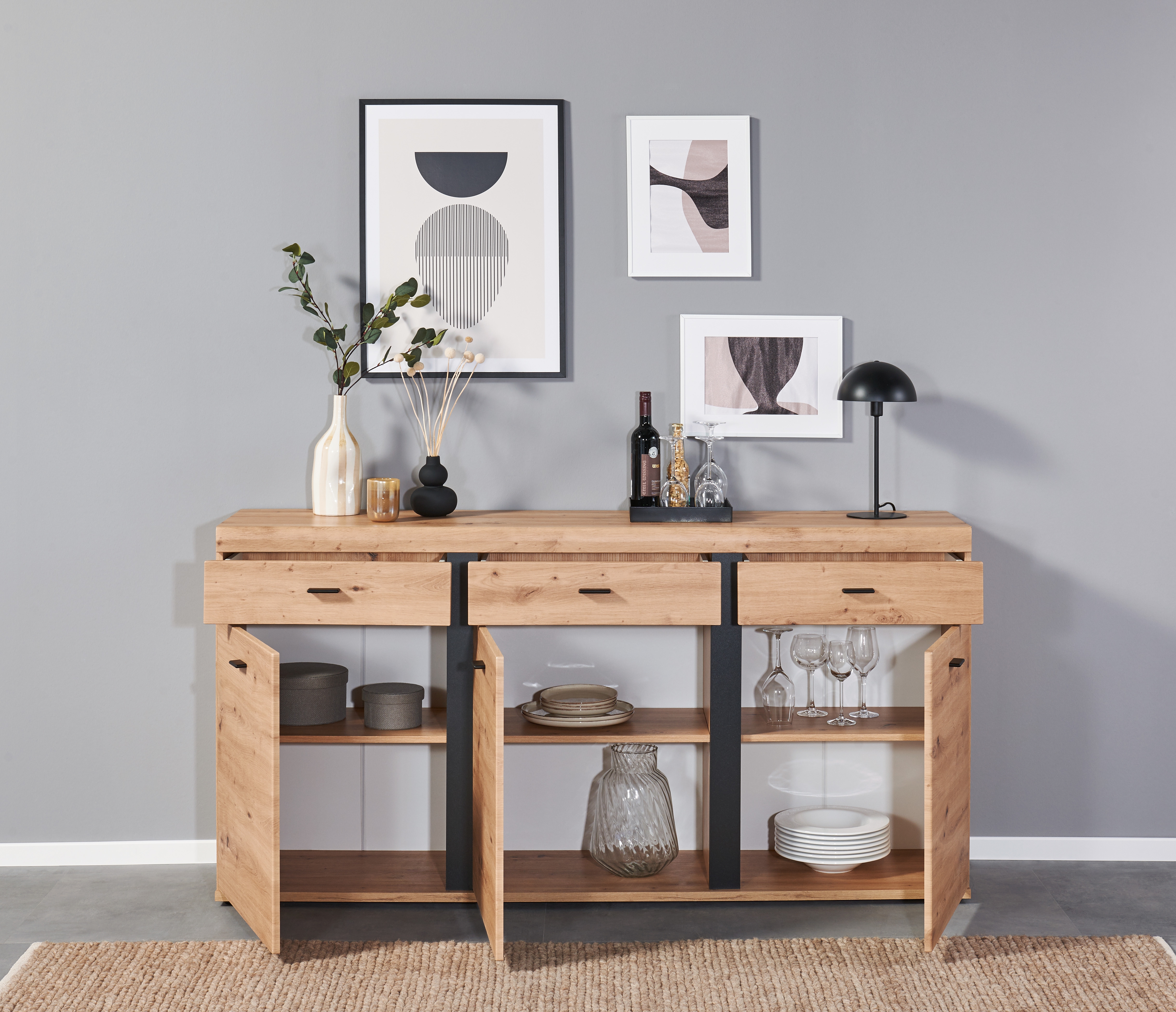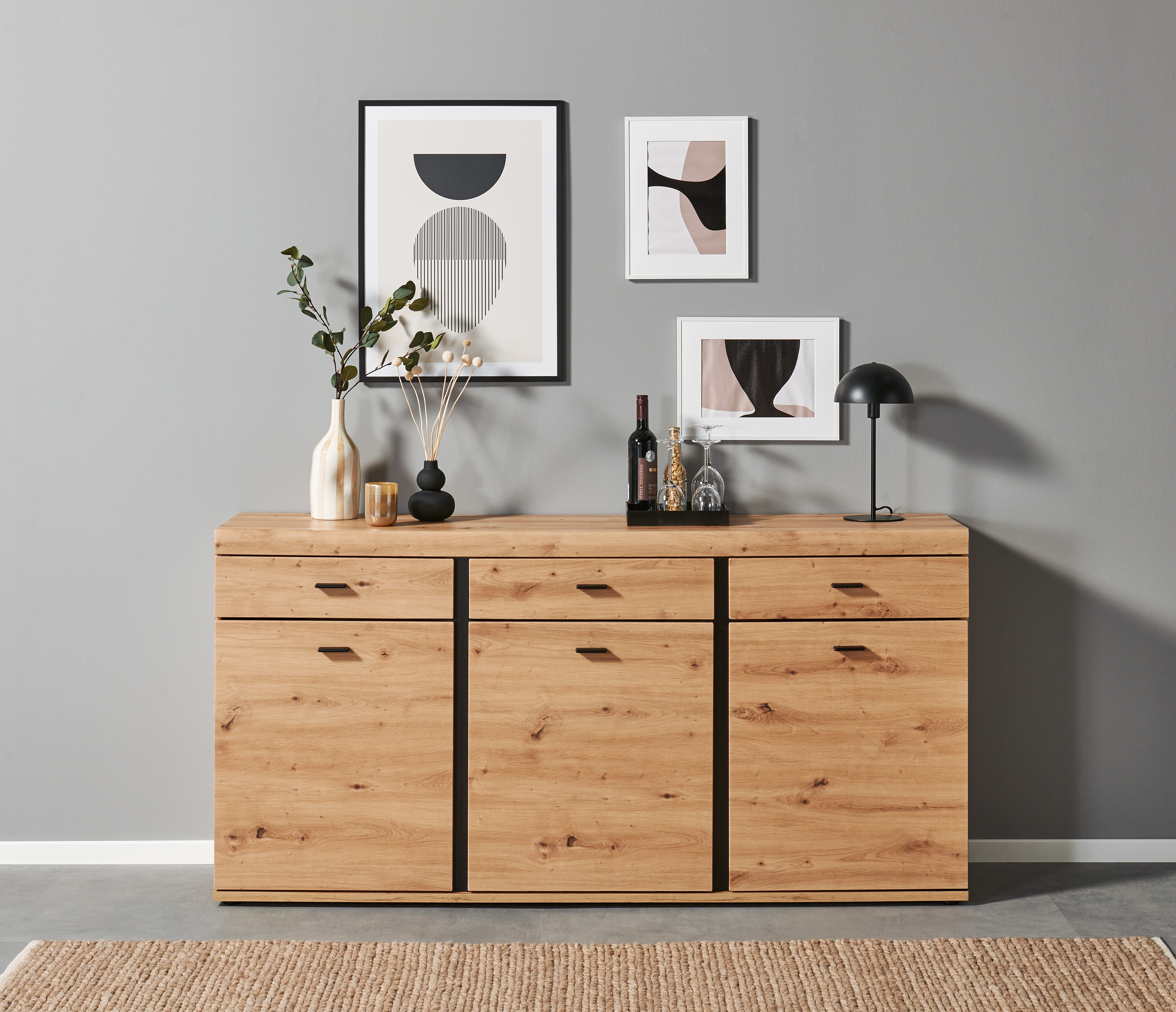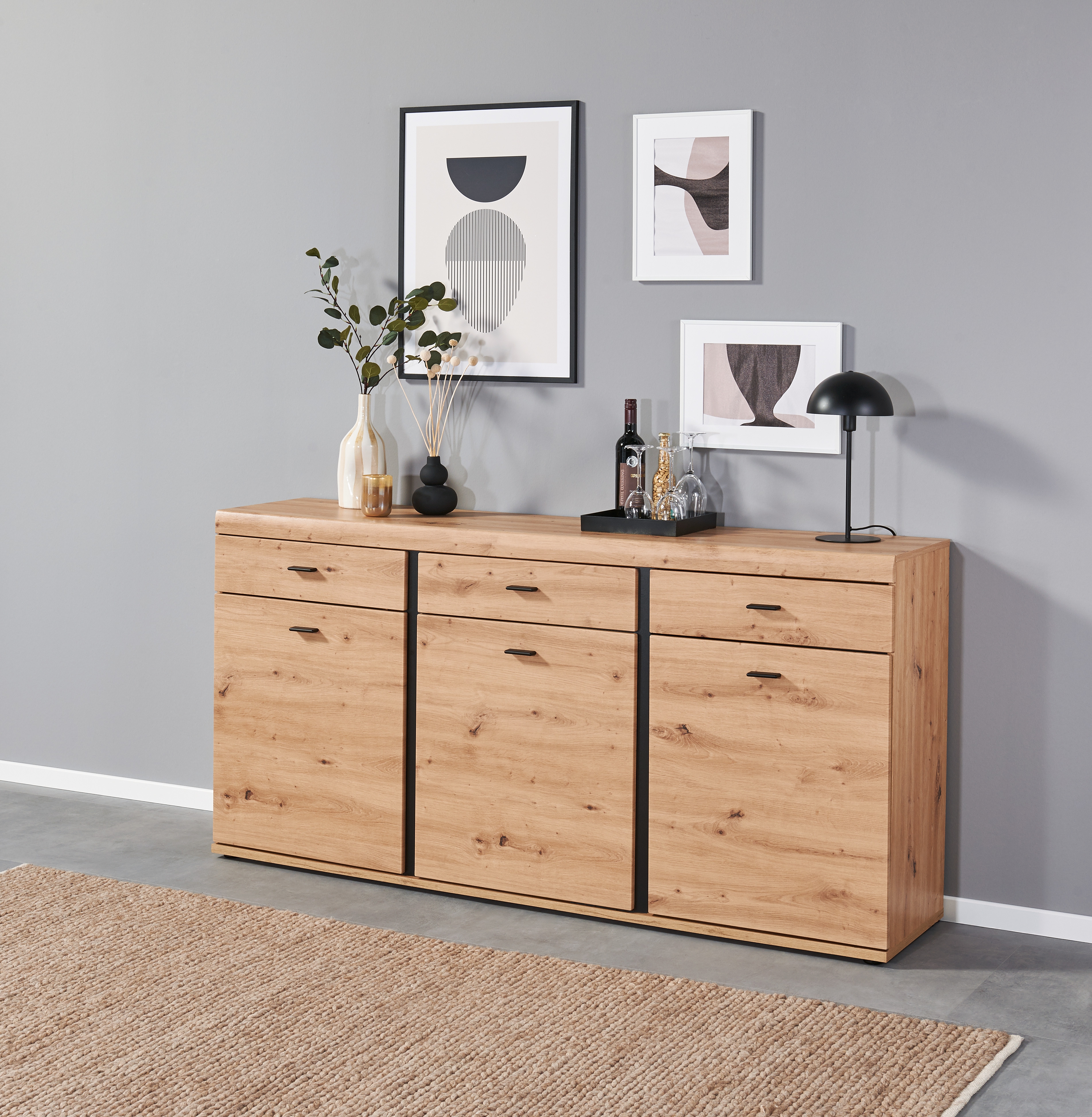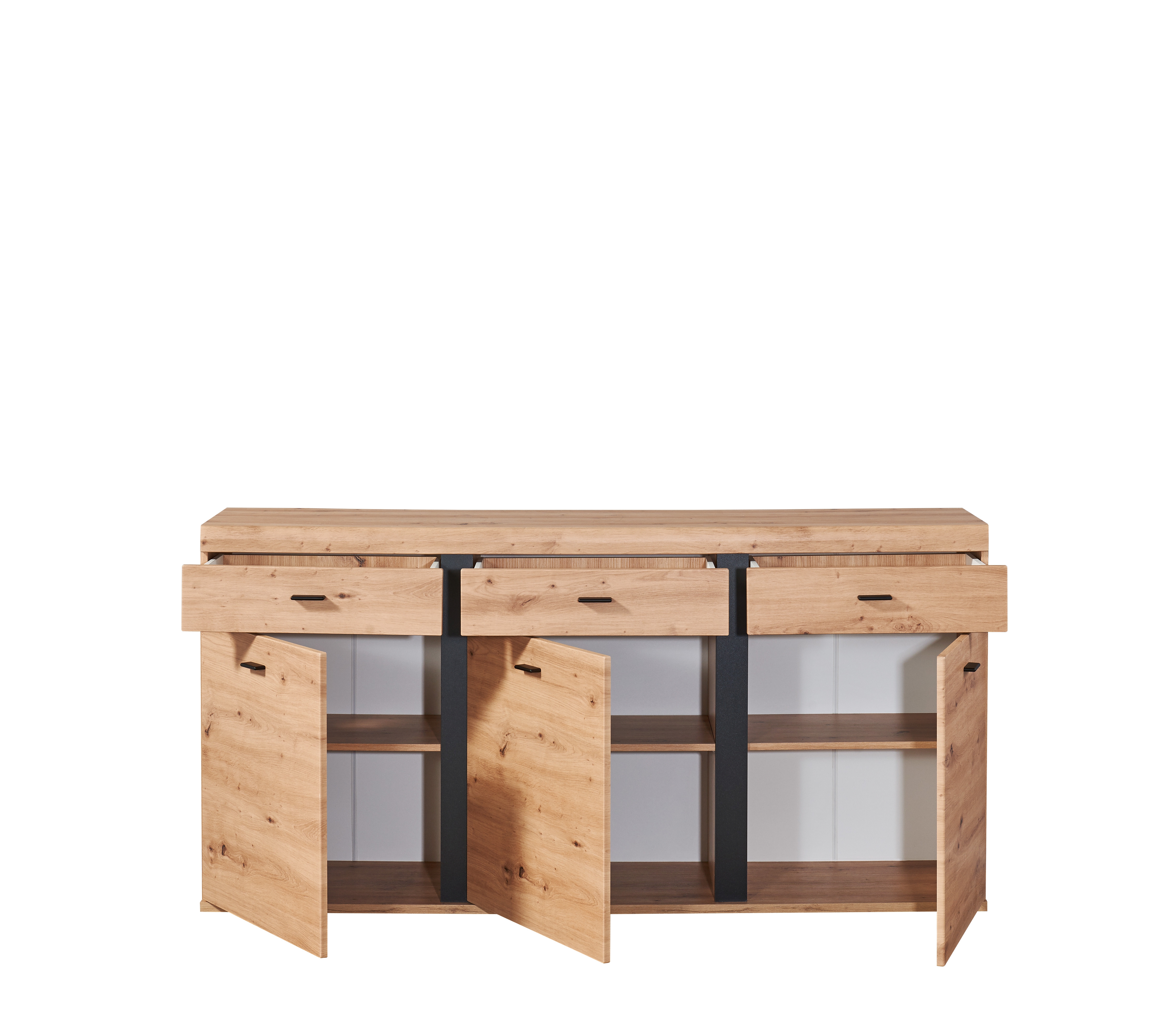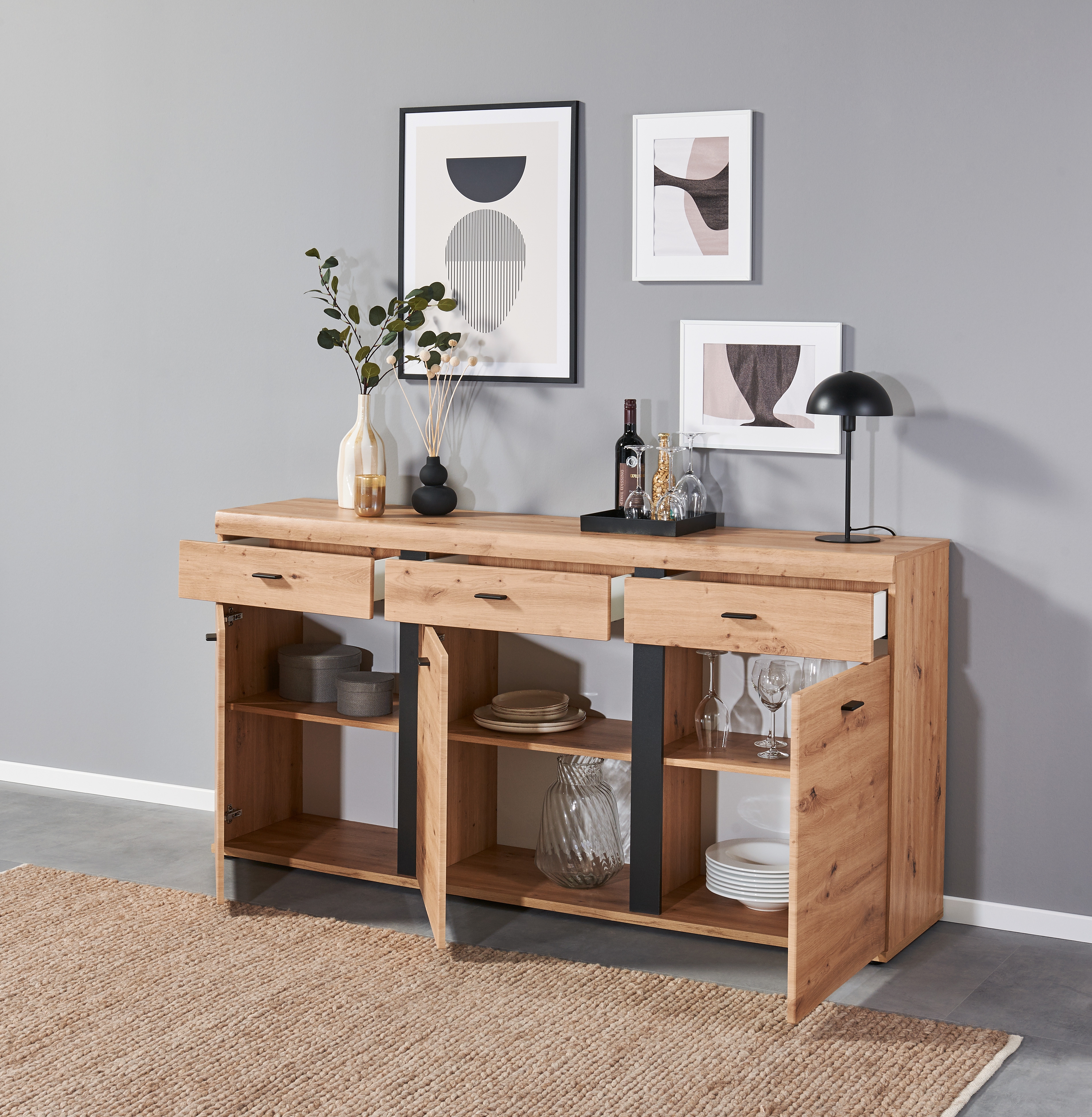 Front: Artisan Eiche Holznachbildung, MDF (Mitteldichte Holzfaserplatte) foliert mit Absetzungen in Schwarz (Spanplatte Melaminbeschichtung)