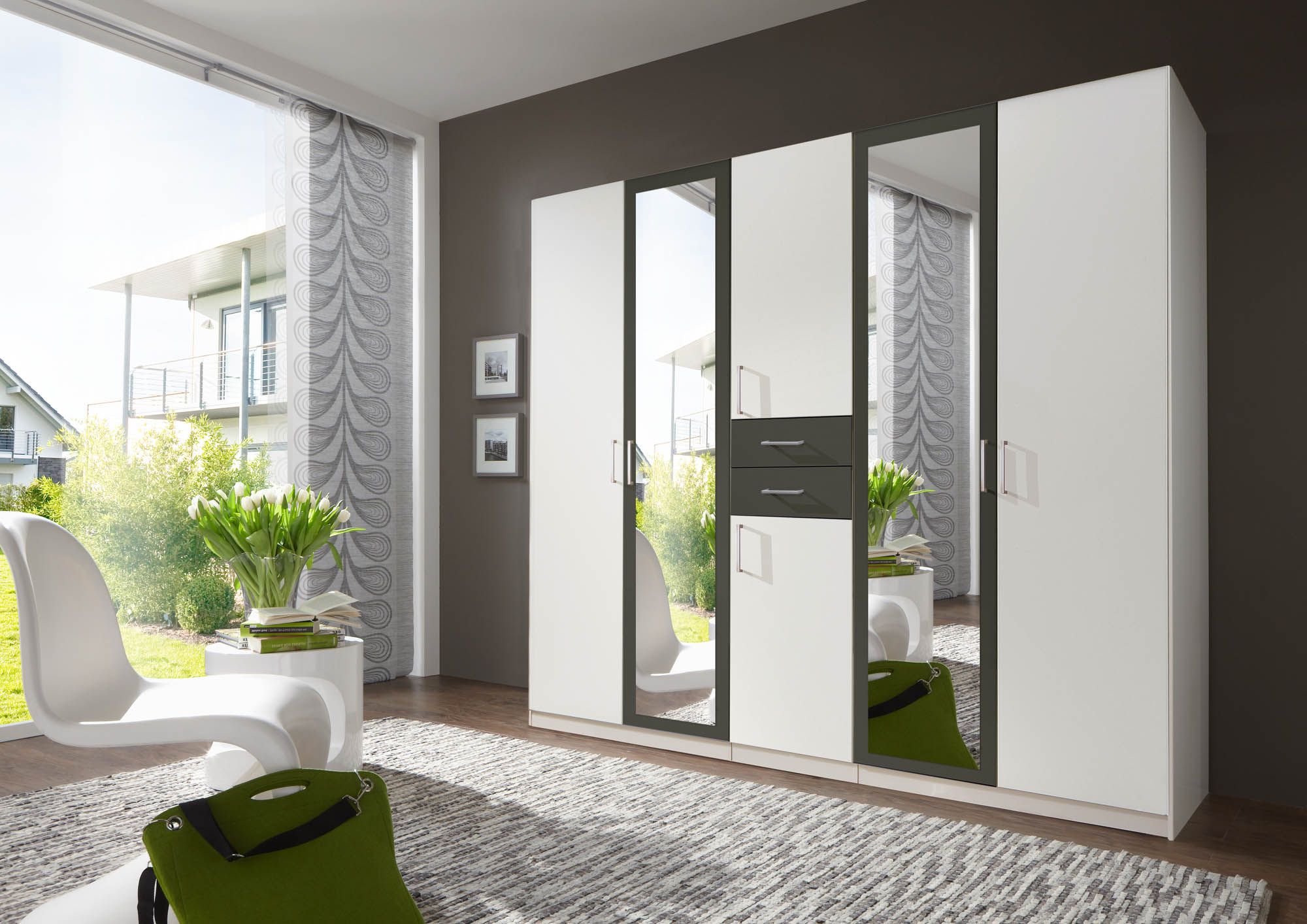 Korpus und Front: Weiß kombiniert mit Absetzungen in Graphit / Spiegel