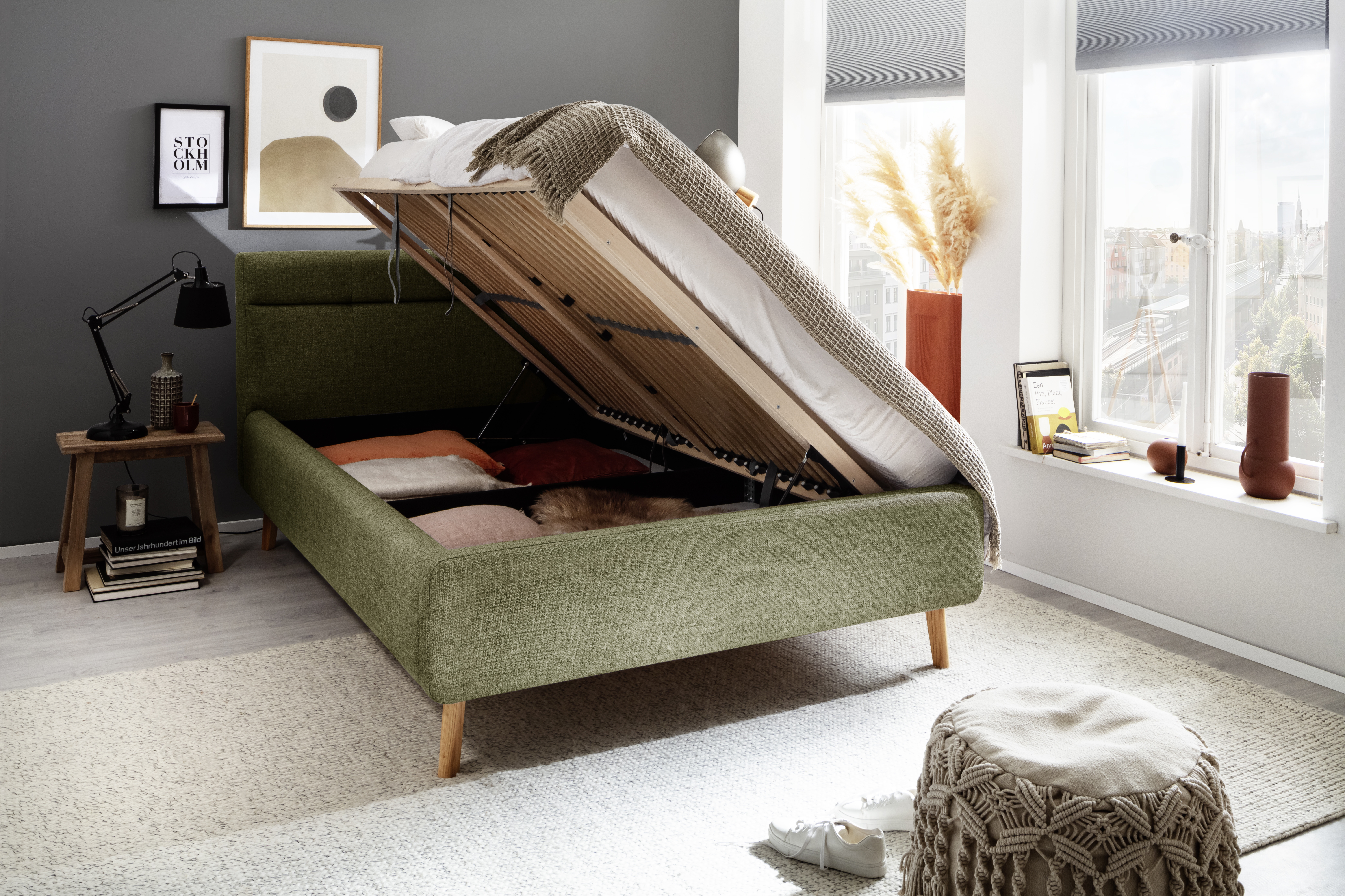 inklusive belüftetem Bettkasten und seitlich zu öffnenden Federholzrahmen