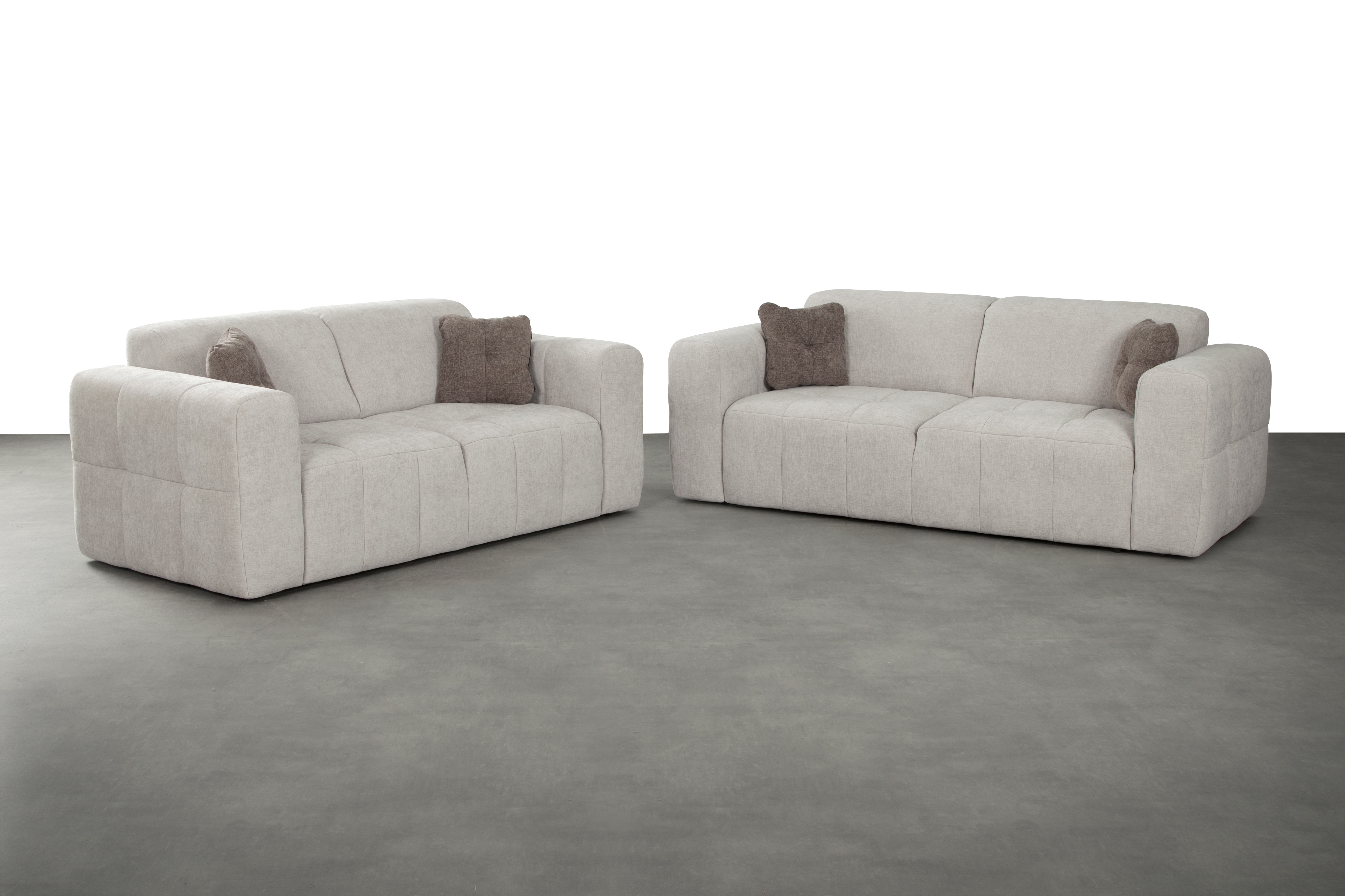 Bezug: 2-Sitzer im Stoff Dove 6174 in der Farbe silberbeige aus 100% Polyester; Zierkissen im Stoff Sone 6170 in der Farbe mocca aus 100% Polyester