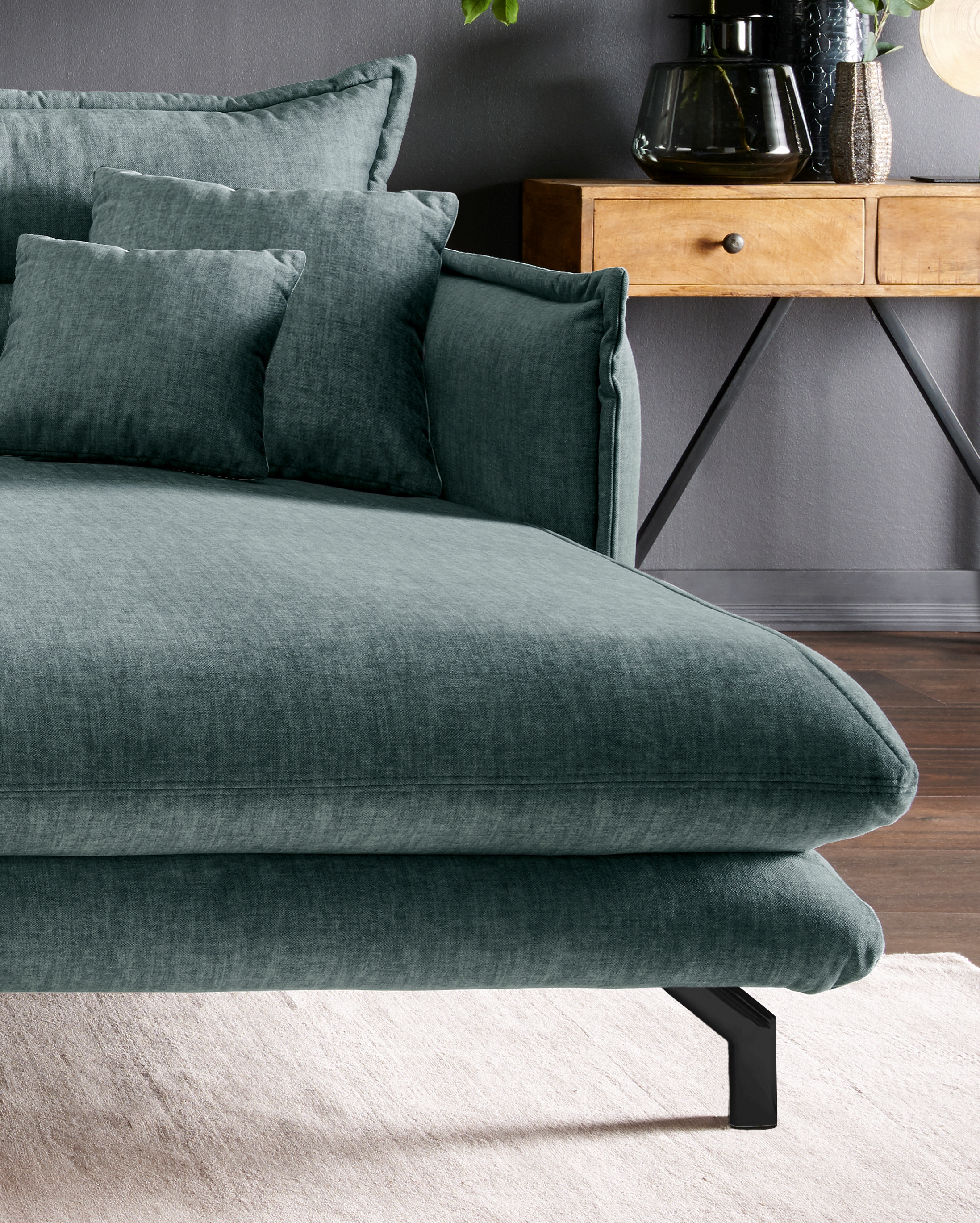 | Ausstattung Polster: | Ottomane rechts, Rücken echt, inkl. Kissen | ||