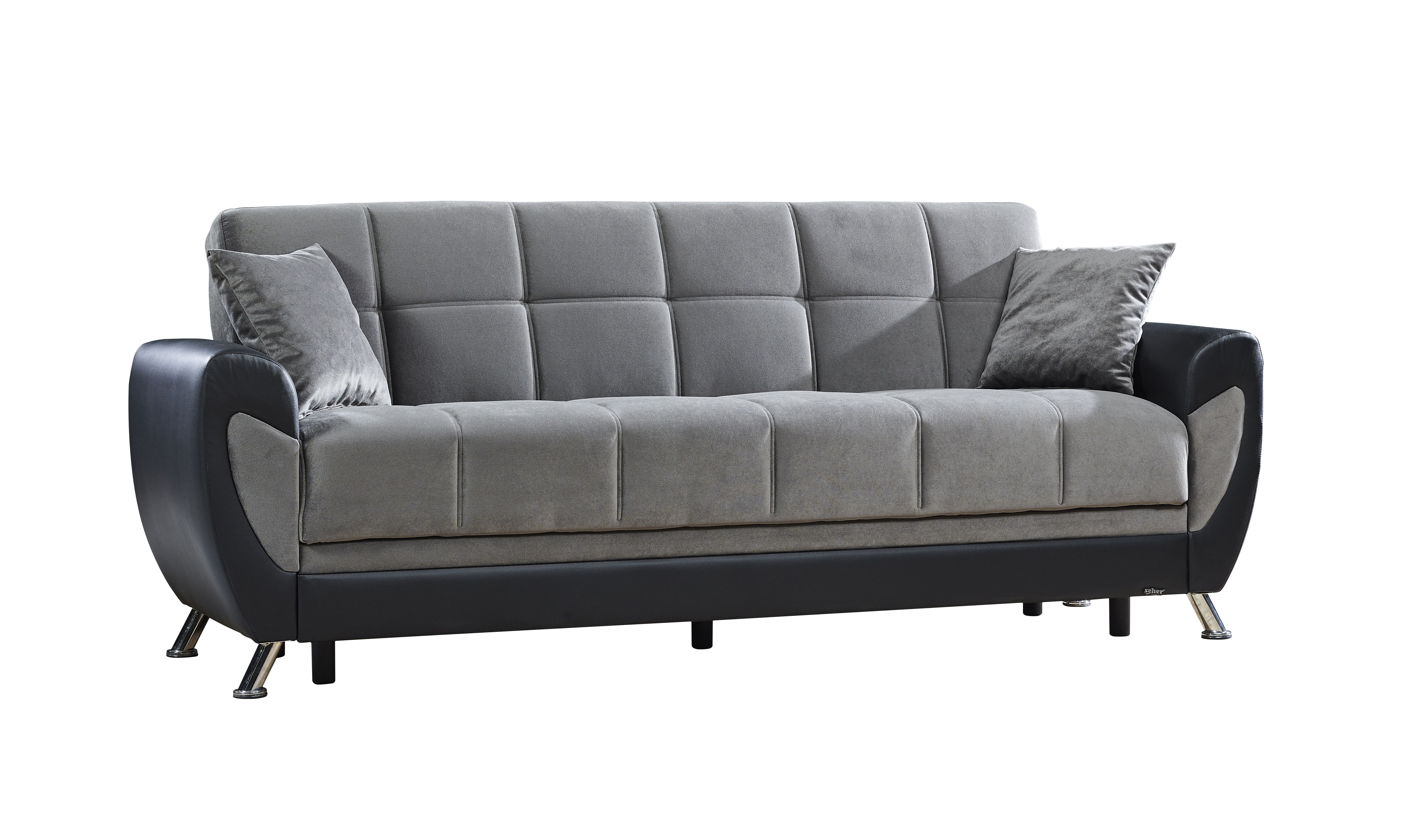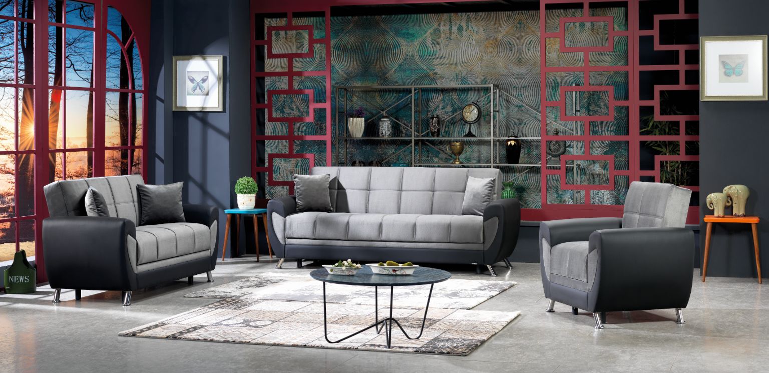 Bezug: Sitz und Rücken im Stoff Melon 715 in der Farbe grau aus 70% Polyester und 30% Baumwolle; Korpus in einem schwarzen Kunstleder aus 100% Polyurethan