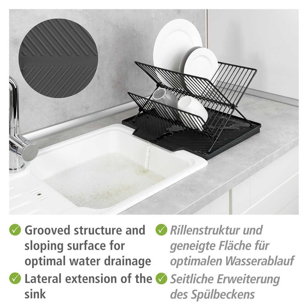 Optimale Trocknung: Die große Abtropfmatte bietet einen besonderen Vorteil. Durch die geneigte Fläche und die clevere Rillenstruktur kann das Abtropfwasser problemlos in das Spülbecken zurückfließen. Auf Ihrer Küchenarbeitsfläche entstehen keine Wasserlachen oder Flecken.