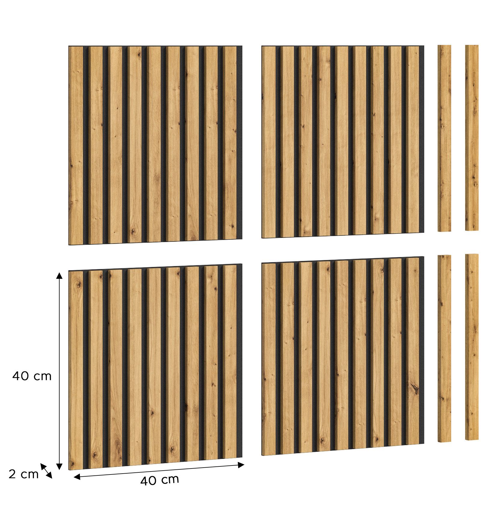 - Design/Stil: Das Akustikpaneel 4er Set in Anthrazit und Artisan Eiche Nachbildung präsentiert sich mit einem modernen und ansprechenden Design, das durch die Kombination von verschiedenen Farben und Texturen einen interessanten visuellen Effekt erzeugt und sich nahtlos in verschiedene Wohnbereiche einfügt.