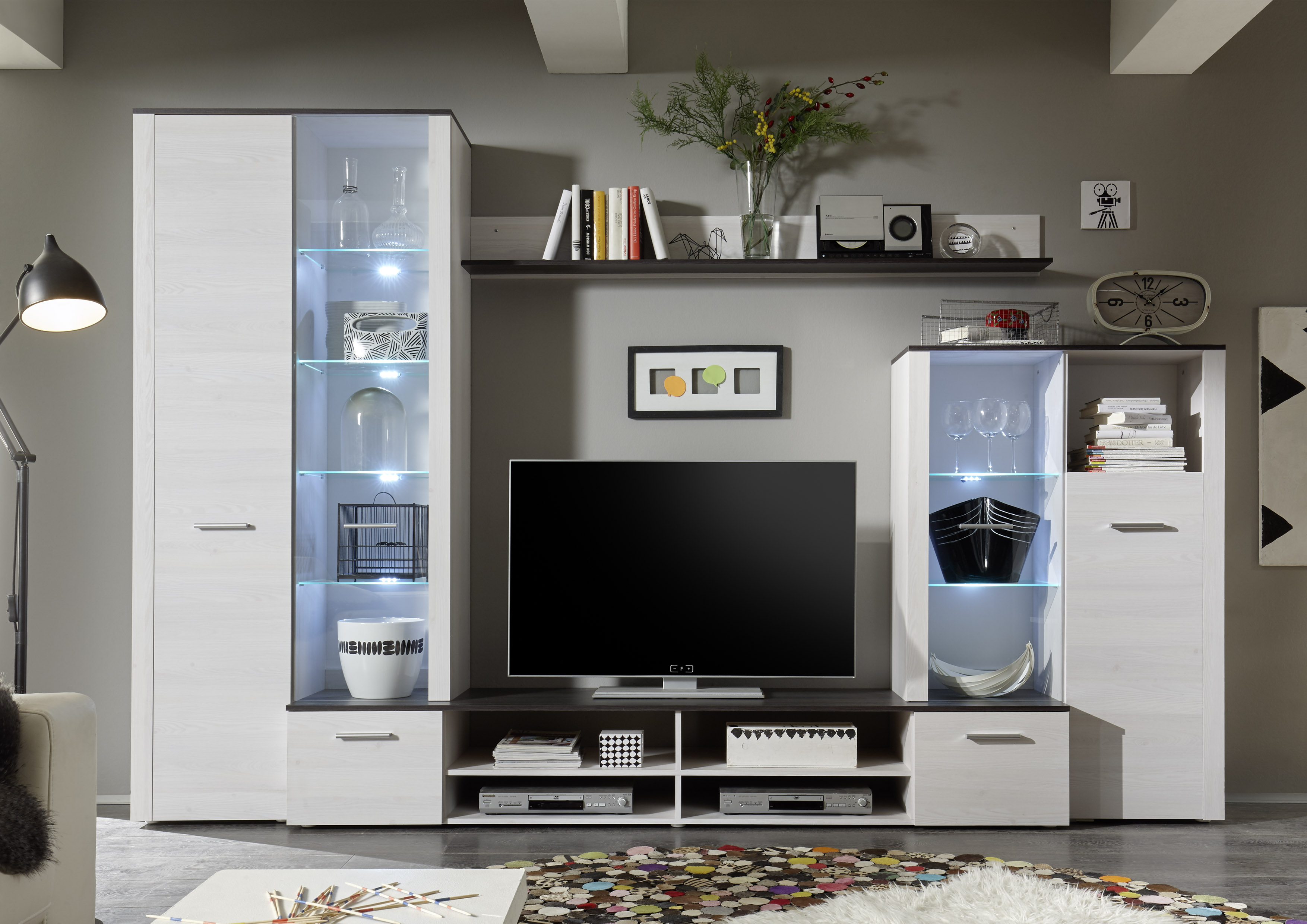 Versprechen Sie sich von Ihrer neuen Wohnwand eine optische Aufwertung für Ihr Wohnzimmer und endlich mal Platz für all Ihre Wohnzimmereinrichtung? Genau dieses Versprechen könnte die Wohnwand DAKAR einlösen! Denn hier erwarten Sie ein modernes, frisches Design in Weiß und Holznachbildung sowie ein gigantisches Platzangebot verteilt auf vier Wohnzimmermöbel.Anbauwand DAKAR, 5-teilig, mit LED Beleuchtung
