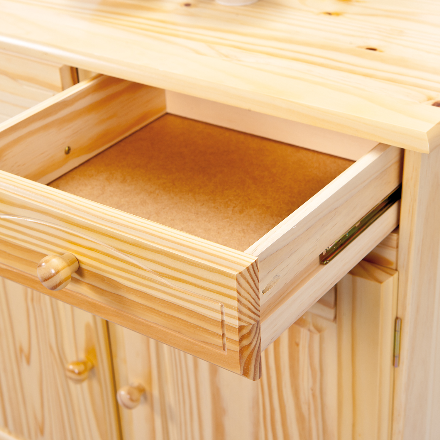 Die Oberfläche des Massivholzes (Weihrauchkiefer) ist mit einem transparenten, schadstoffarmen Klarlack versiegelt. Dies macht das Möbelstück besonders pflegeleicht, widerstandsfähig und wasserabweisend.