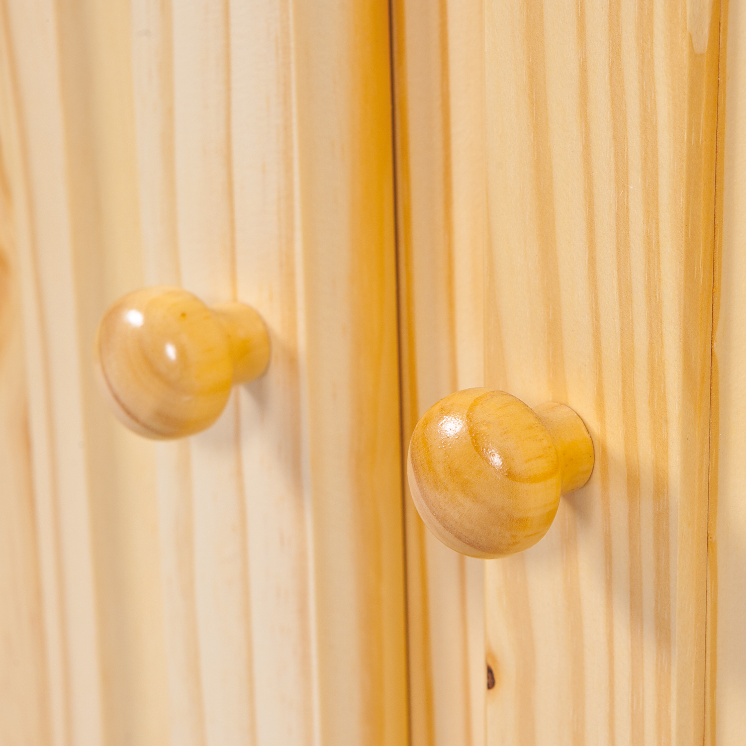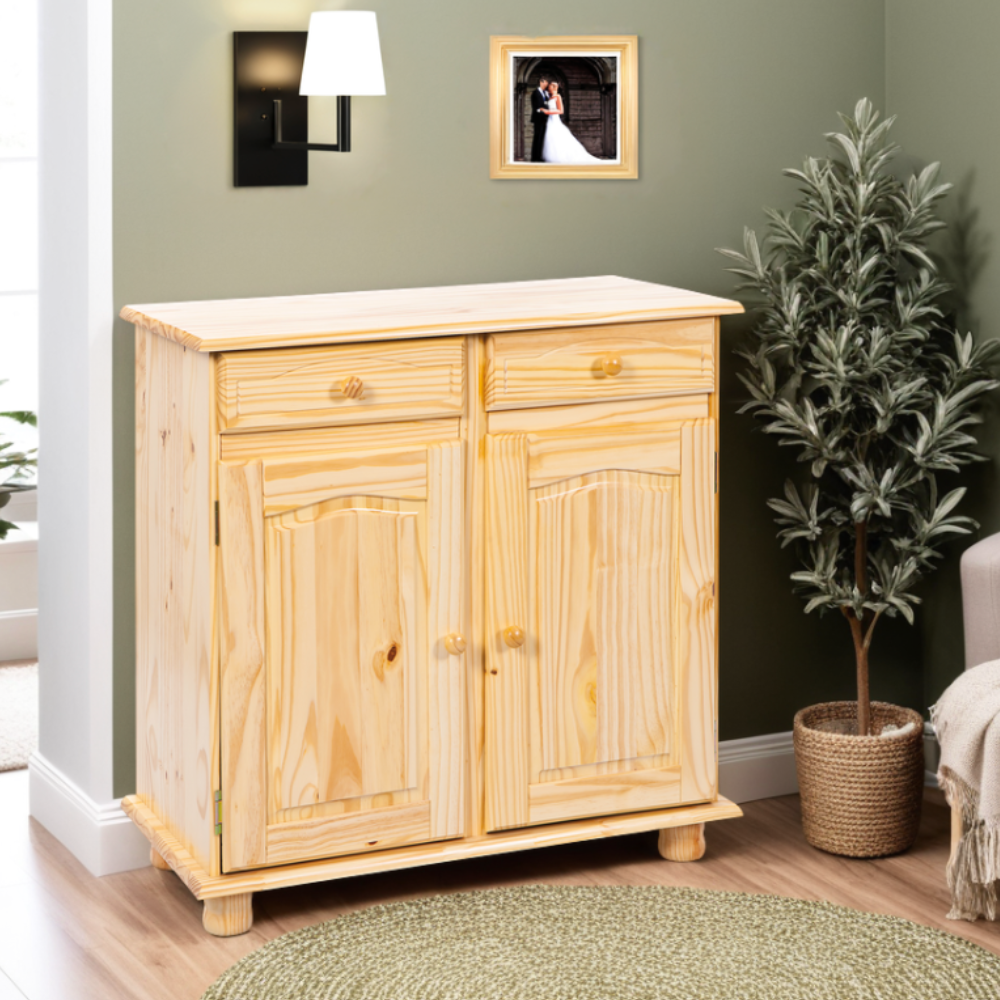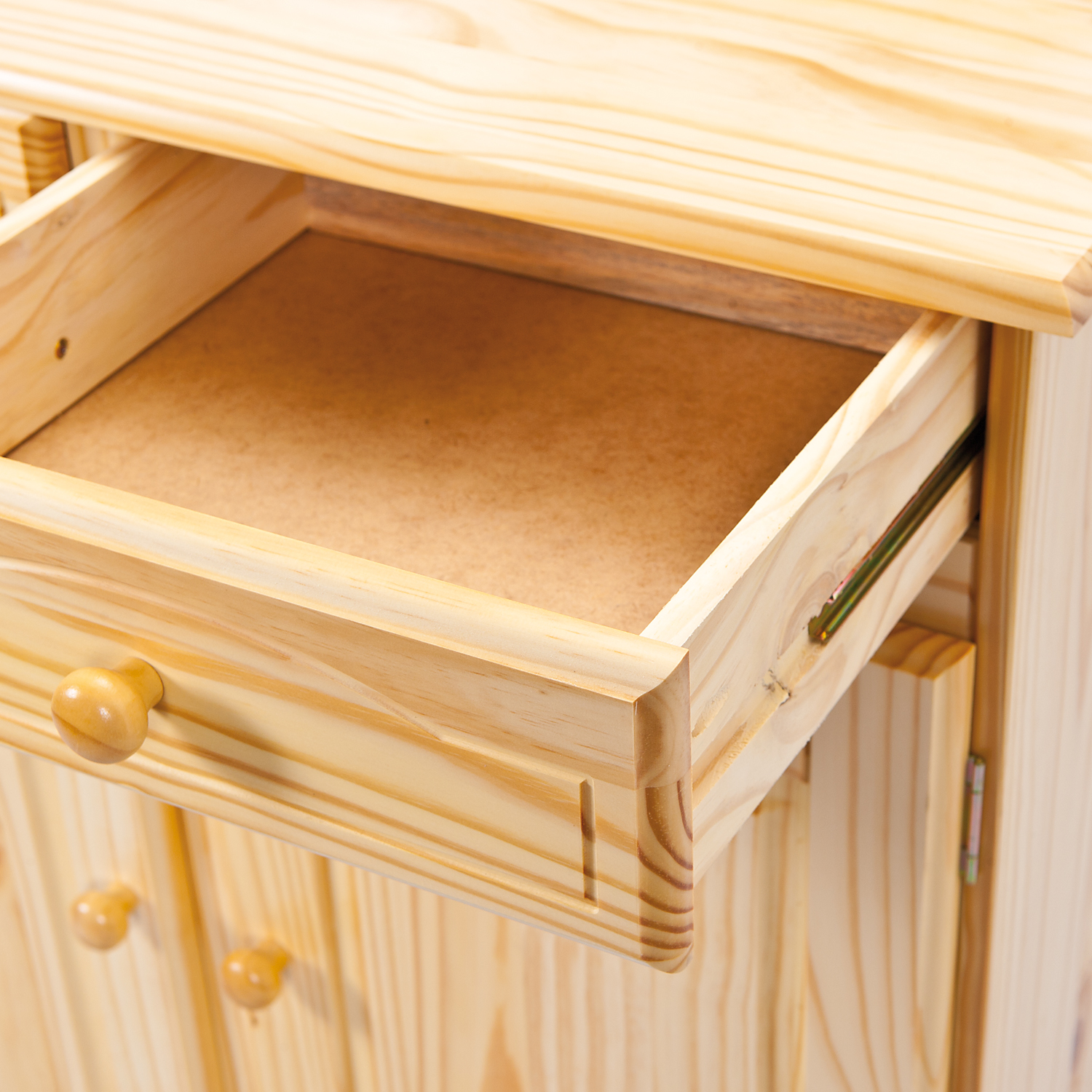 Die Oberfläche des hochwertigen Massivholzes (Weihrauchkiefer) ist mit einem transparenten, schadstoffarmen Klarlack versiegelt. Dadurch bleibt das Holz pflegeleicht, wasserabweisend und besonders langlebig. Jede Kommode wird aus sorgfältig ausgewähltem Massivholz gefertigt und nach strengen Qualitätskriterien verarbeitet. Das Ergebnis ist ein hochwertiges, nachhaltiges Möbelstück, das nach europäischen Umweltstandards produziert wird.