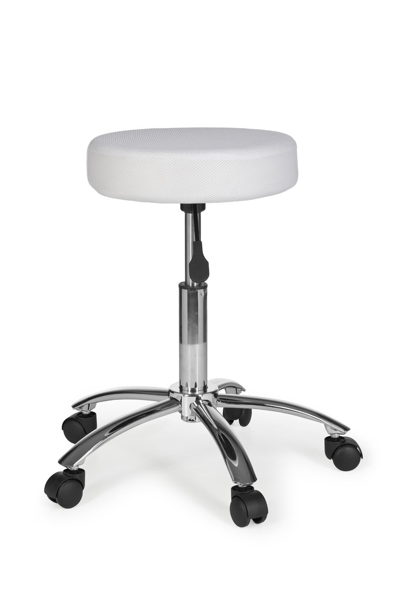 Robuster Arbeitshocker mit einer Mesh-Netzbezogener Sitzfläche in der Farbe Weiß.