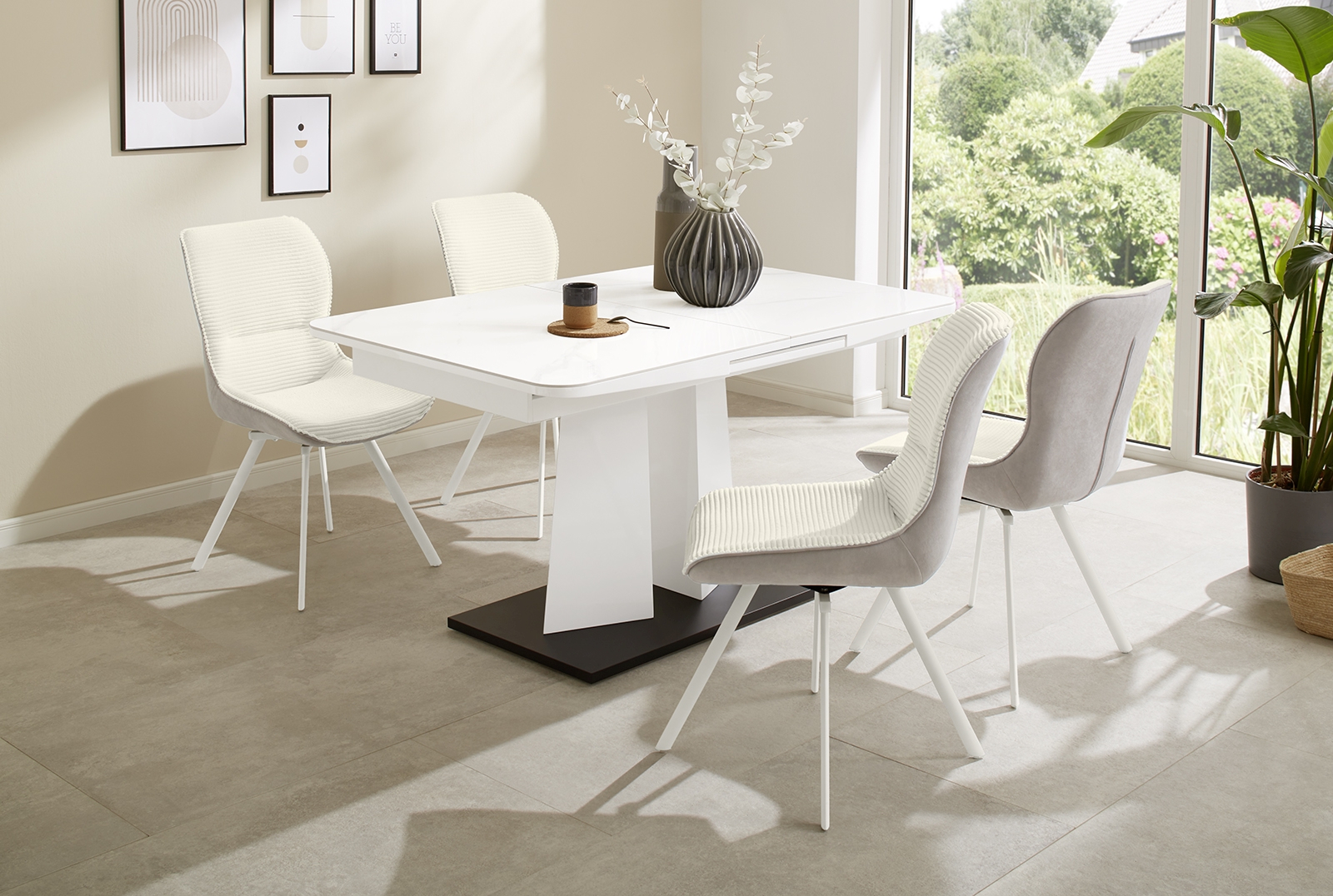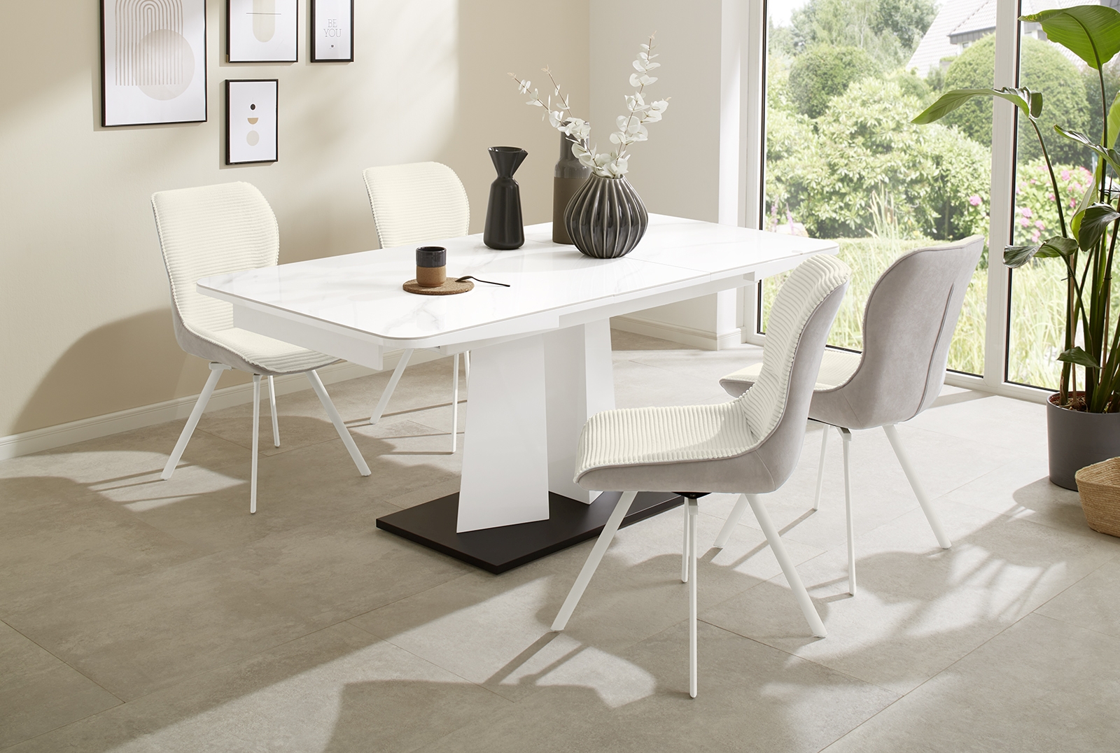 Tischplatte: Keramik in Hochglanz Weiß, veredelt mit eleganten Elementen in Marmoroptik