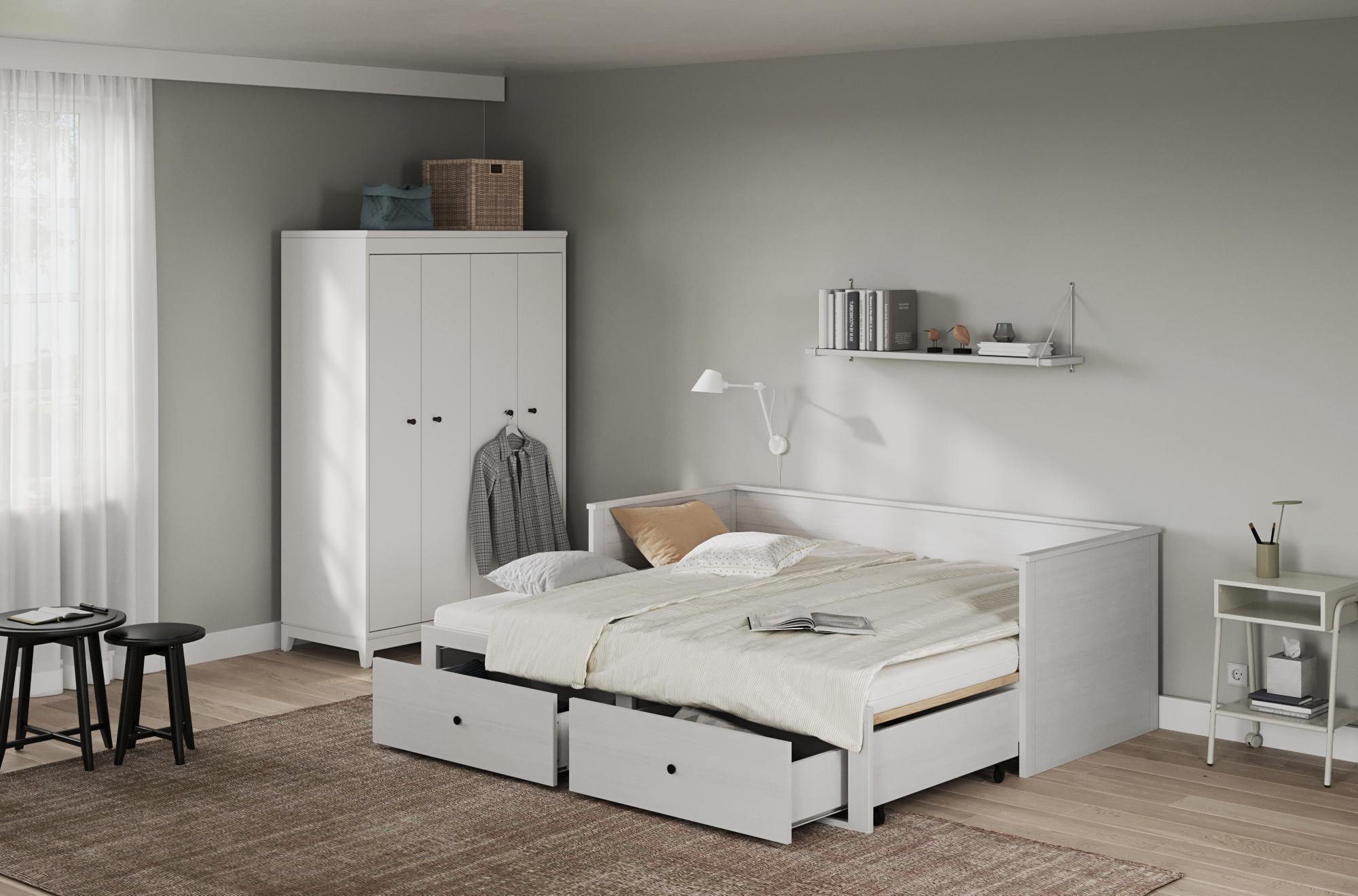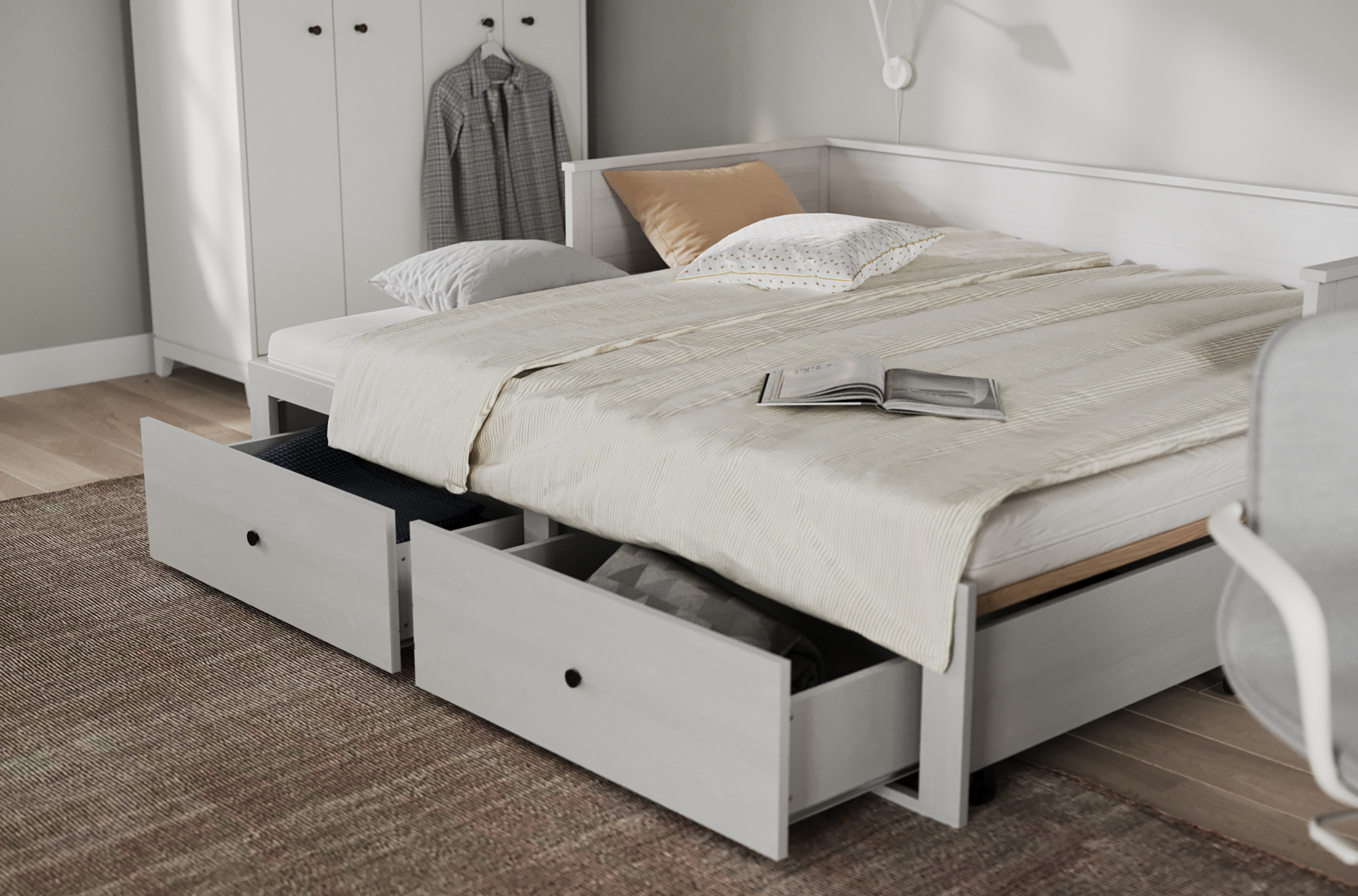 2 Liegeflächen; das Unterteil ist auf Rollen ausziehbar für eine zweite Schlafmöglichkeit