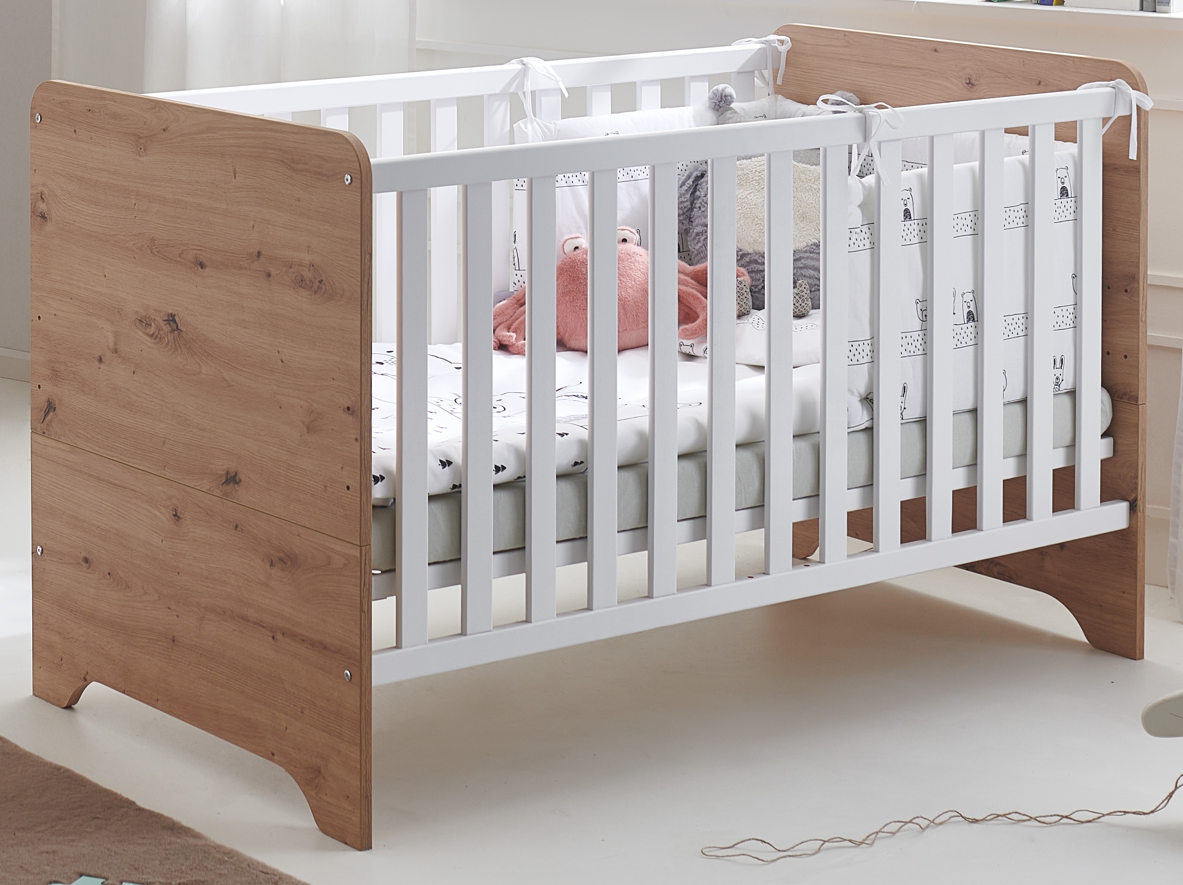 1 Babybett inklusive 4-fach höhenverstellbarer Lattenrost; Kopf-und Fußteil geteilt; Gitterseiten mit Flachstäben, davon eins mit 3 Schlupfsprossen