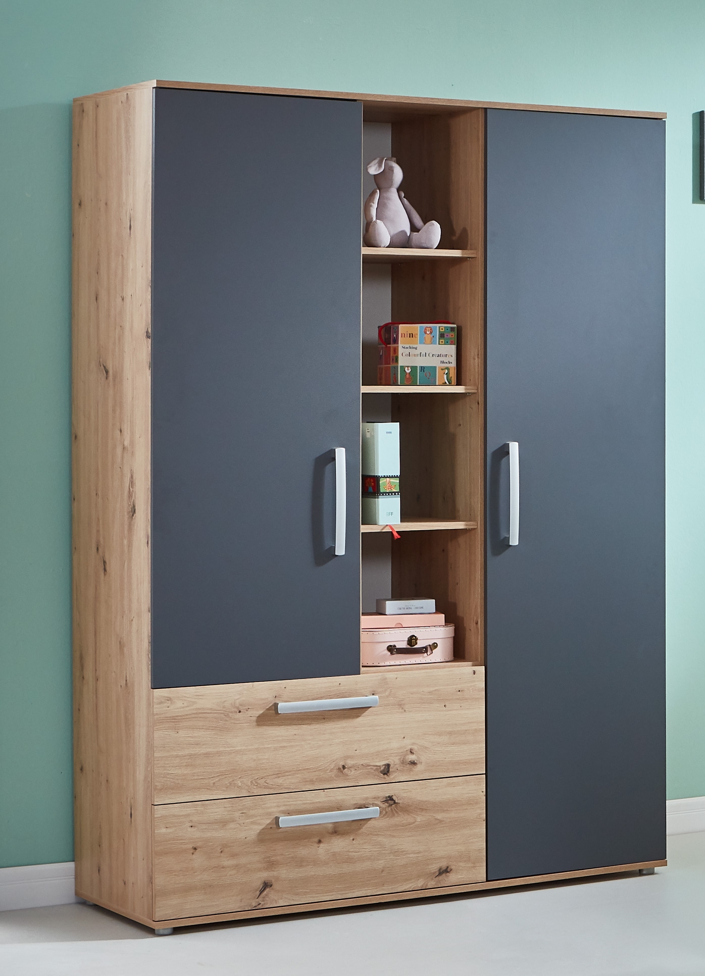 1 Kleiderschrank mit 3 Türen, 2 Schubkästen, 4 offenen Fächern, 4 Einlegeböden und 1 Kleiderstange