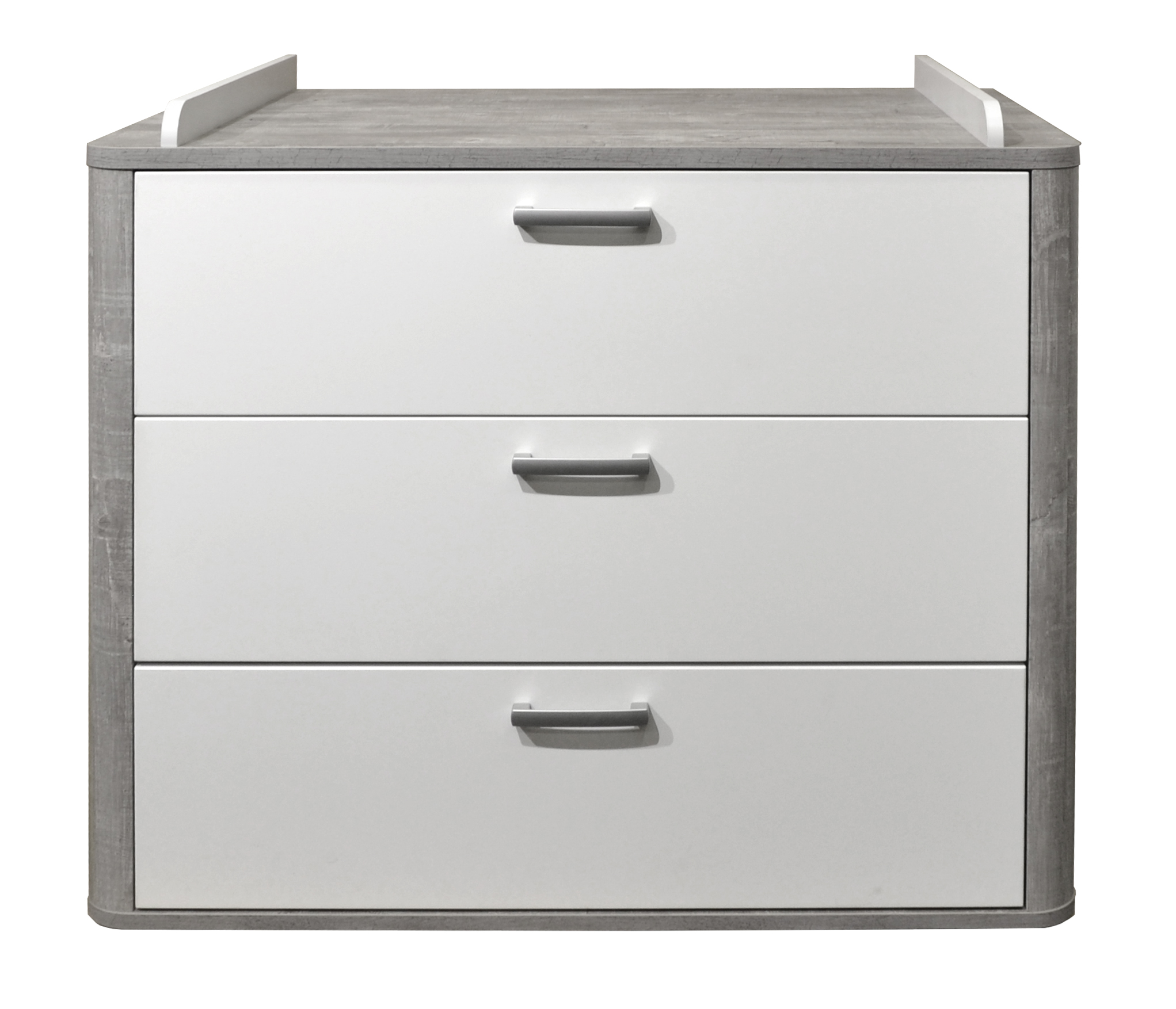 1 Wickelkommode mit abnehmbarem Wickelaufsatz, 2 Sicherungsleisten und 3 Schubkästen