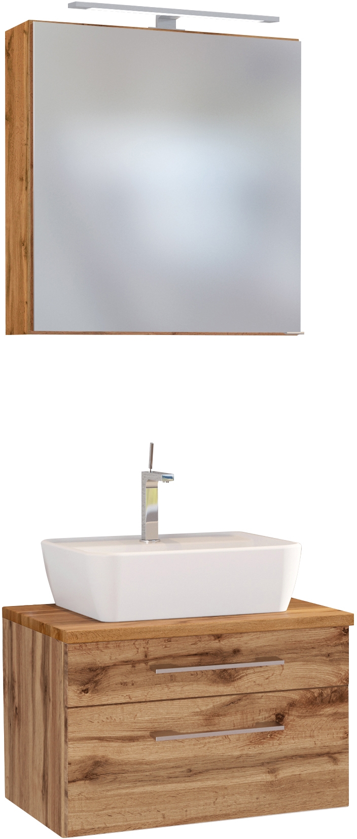 1 Spiegelschrank mit 1 Tür, 2 Einlegeböden, 1 LED-Aufbauleuchte (9,6Watt), inklusive Trafobox, Schalter und Steckdose