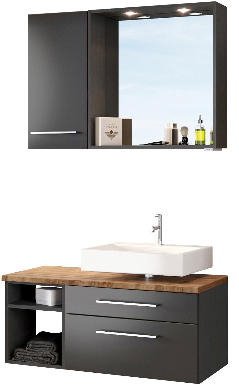 1 Waschbeckenunterschrank mit 1 Schubkasten und 1 Auszug mit Softclose-Funktion und 2 offenen Fächern, inklusive Siphonausschnitt rechts