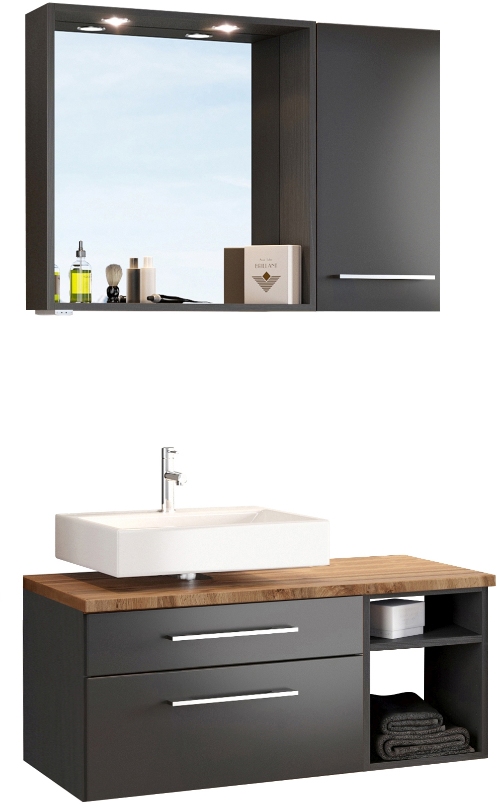 1 Waschbeckenunterschrank mit 1 Schubkasten und 1 Auszug mit Softclose-Funktion und 2 offenen Fächern, inklusive Siphonausschnitt links