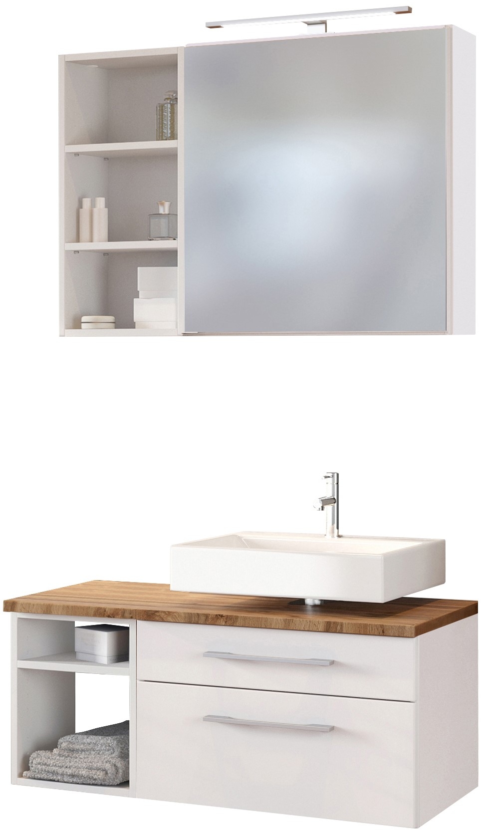 1 Waschbeckenunterschrank mit 1 Schubkasten und 1 Auszug mit Softclose-Funktion und 2 offenen Fächern, inklusive Siphonausschnitt rechts