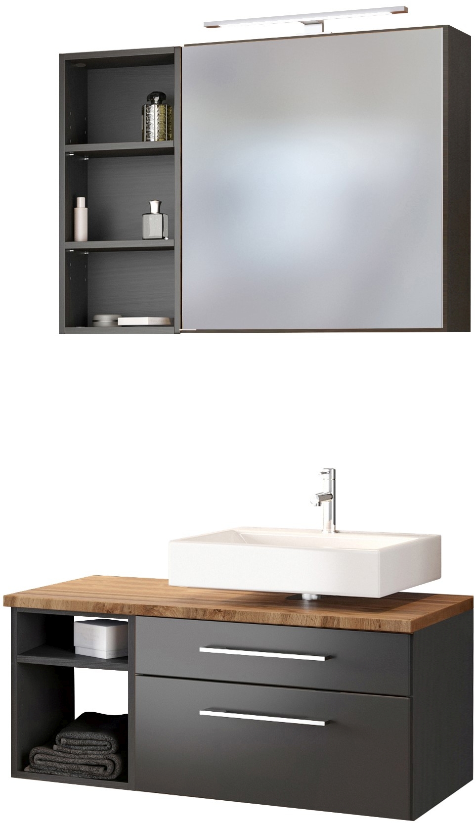 1 Waschbeckenunterschrank mit 1 Schubkasten und 1 Auszug mit Softclose-Funktion und 2 offenen Fächern, inklusive Siphonausschnitt rechts