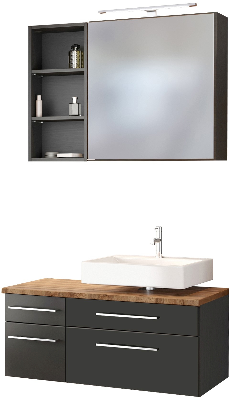 1 Spiegelschrank mit 1 Tür, 2 Einlegeböden, 1 LED-Aufbauleuchte (9,6 Watt), inklusive Trafobox, Schalter und Steckdose