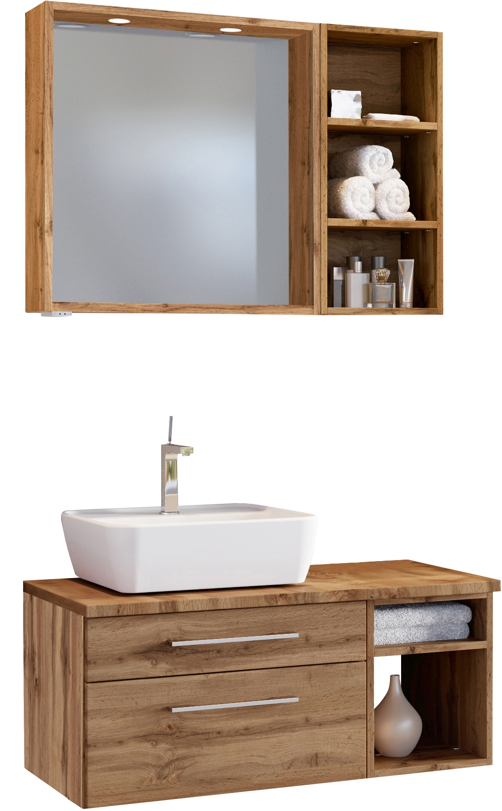 1 Waschbeckenunterschrank mit 1 Schubkasten und 1 Auszug mit Softclose-Funktion und 2 offenen Fächern, inklusive Siphonausschnitt
