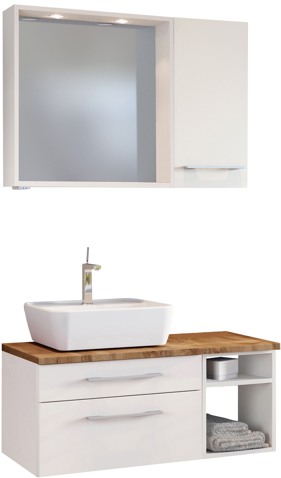 1 Waschbeckenunterschrank mit 1 Schubkasten und 1 Auszug mit Softclose-Funktion und 2 offenen Fächern, inklusive Siphonausschnitt