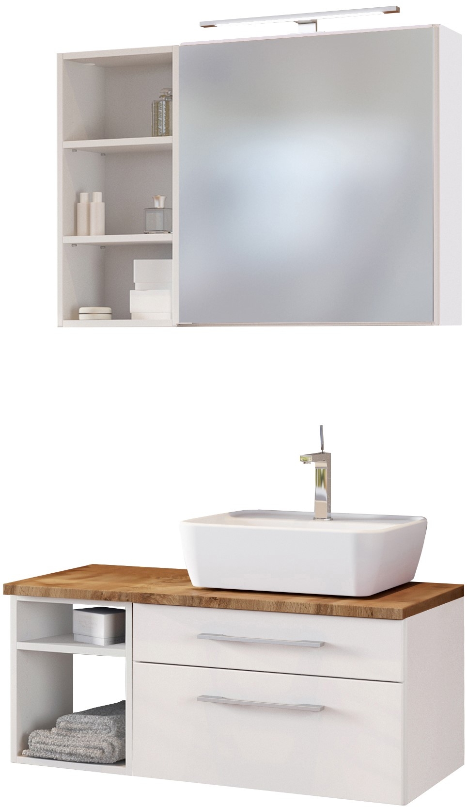 1 Spiegelschrank mit 1 Tür, 2 Einlegeböden, 1 LED-Aufbauleuchte (9,6 Watt), inklusive Trafobox, Schalter und Steckdose