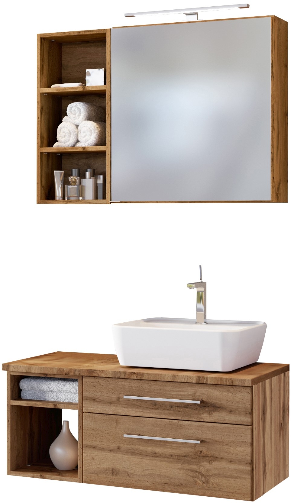 1 Spiegelschrank mit 1 Tür, 2 Einlegeböden, 1 LED-Aufbauleuchte (9,6 Watt), inklusive Trafobox, Schalter und Steckdose