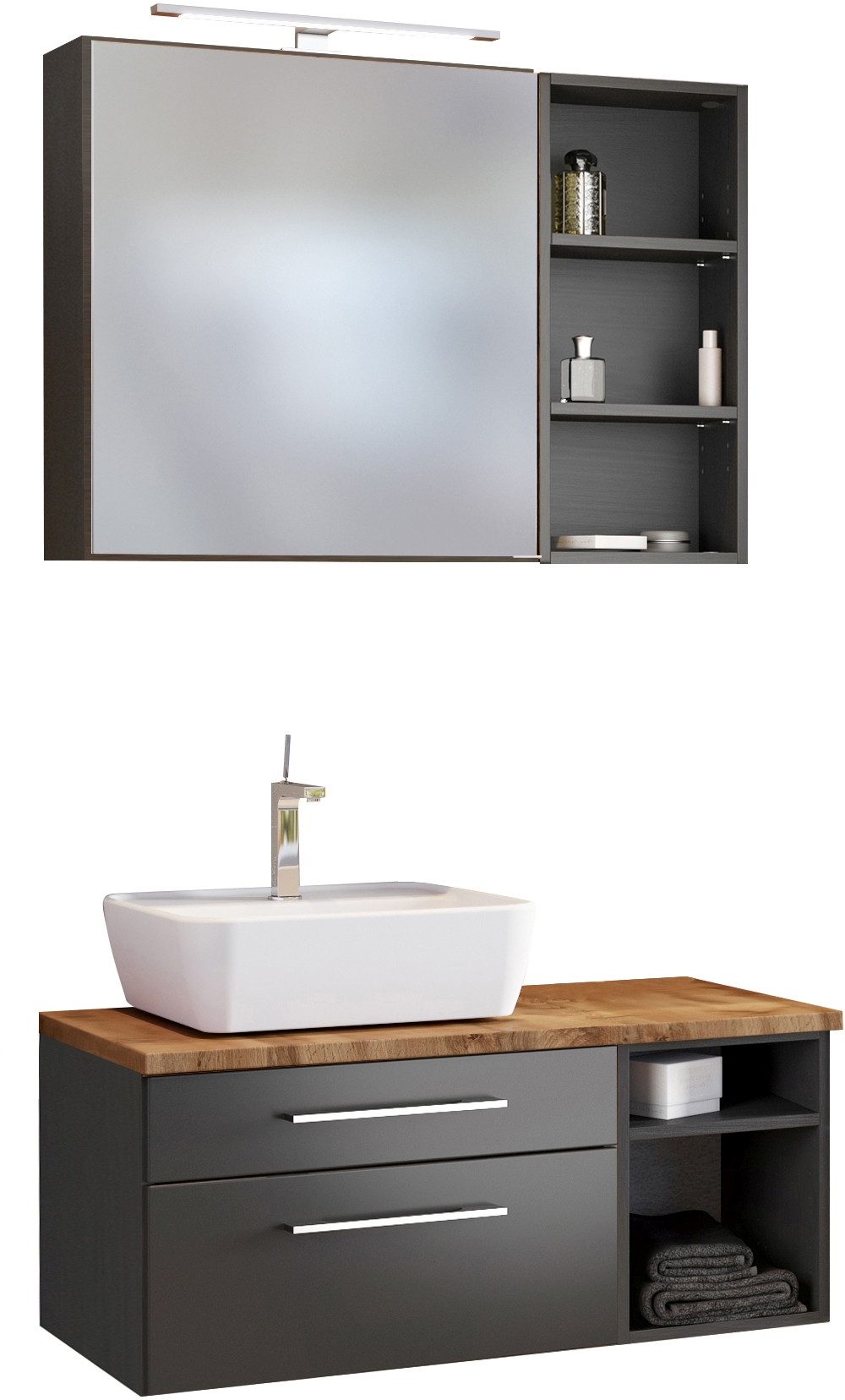 1 Waschbeckenunterschrank mit 1 Schubkasten und 1 Auszug mit Softclose-Funktion und 2 offenen Fächern, inklusive Siphonausschnitt