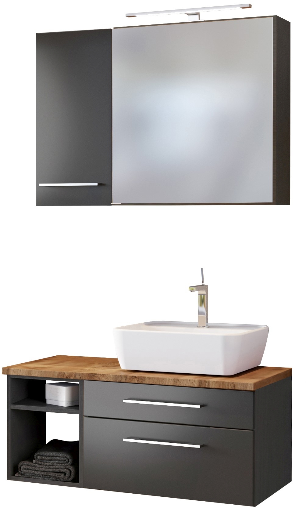 1 Waschbeckenunterschrank mit 1 Schubkasten und 1 Auszug mit Softclose-Funktion und 2 offenen Fächern, inklusive Siphonausschnitt