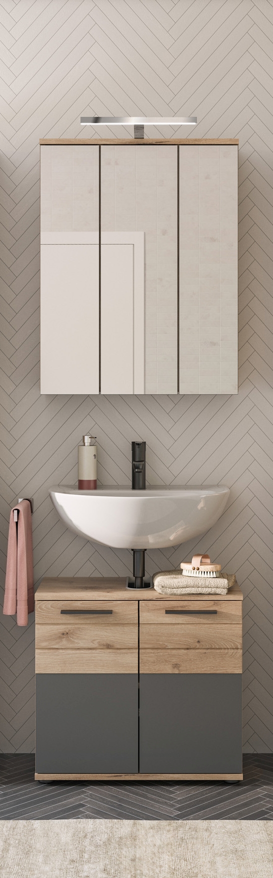 Verwandeln Sie Ihr Badezimmer in eine Oase der Entspannung mit unserer vielseitigen Badkombination in Nox Oak und Basalt grau Nachbildung. Bestehend aus Waschbeckenunterschrank und Spiegelschrank, bietet sie nicht nur ausreichend Stauraum, sondern auch ein modernes Design. Mit ihrer hochwertigen Verarbeitung und der harmonischen Farbkombination wird diese Badkombination zum Blickfang in Ihrem Badezimmer.