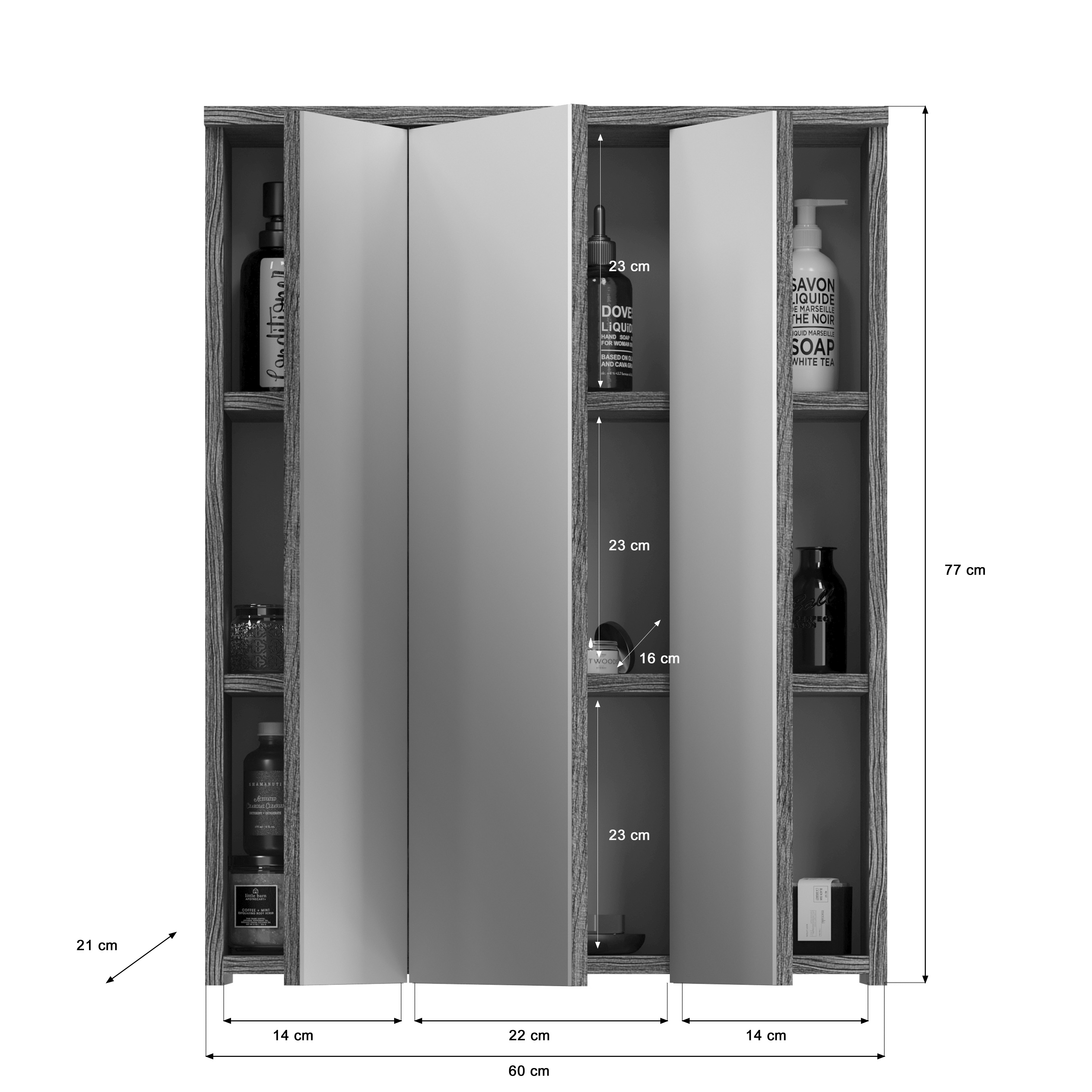 1 Spiegelschrank mit 3 Spiegeltüren und 6 Einlegeböden