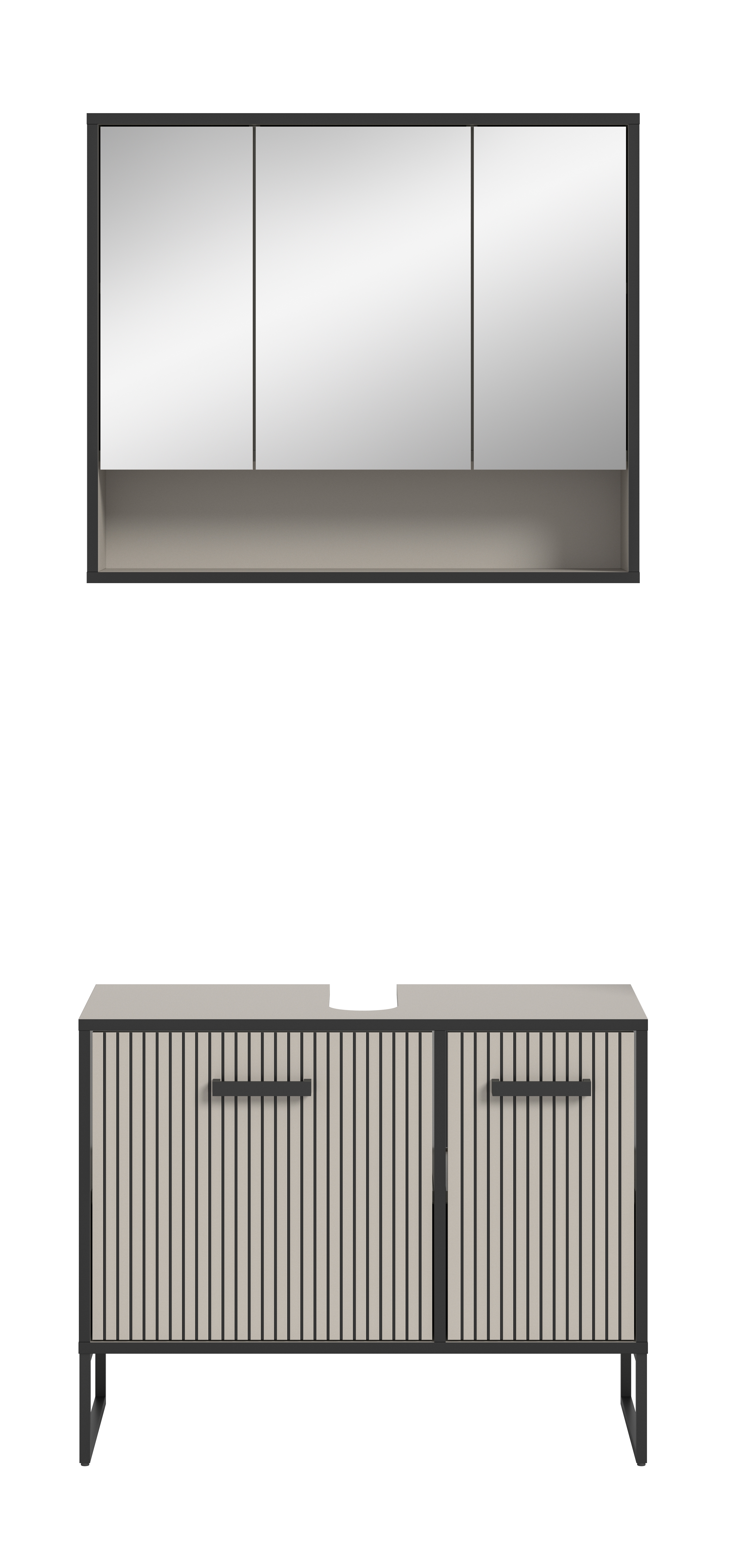 Kompakt und funktional – die 2-teilige Badkombination (B/H/T: 80x192x36 cm) in Kaschmir Holznachbildung bringt Stil in kleine Badezimmer. Ausgestattet mit einem Waschbeckenunterschrank und einem praktischen Spiegelschrank, bietet dieses Set die perfekte Lösung für begrenzte Räume. Die pflegeleichte Oberfläche sorgt dafür, dass Ihr Badezimmer immer frisch und ansprechend aussieht, während die moderne Rillenoptik Ihrer Einrichtung einen eleganten Touch verleiht.