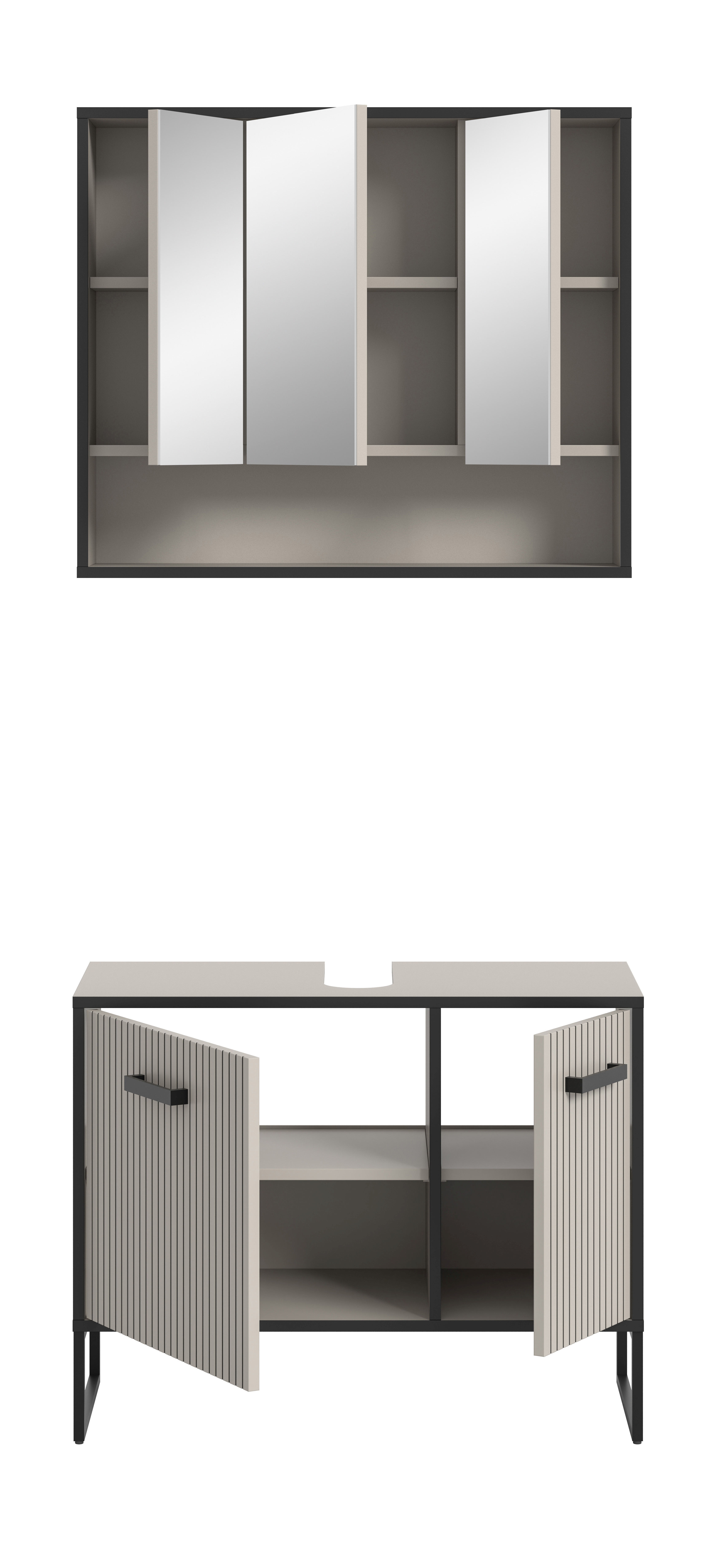 - 2-teilige Badkombination, bestehend aus: 1x Waschbeckenunterschrank, 1x Spiegelschrank