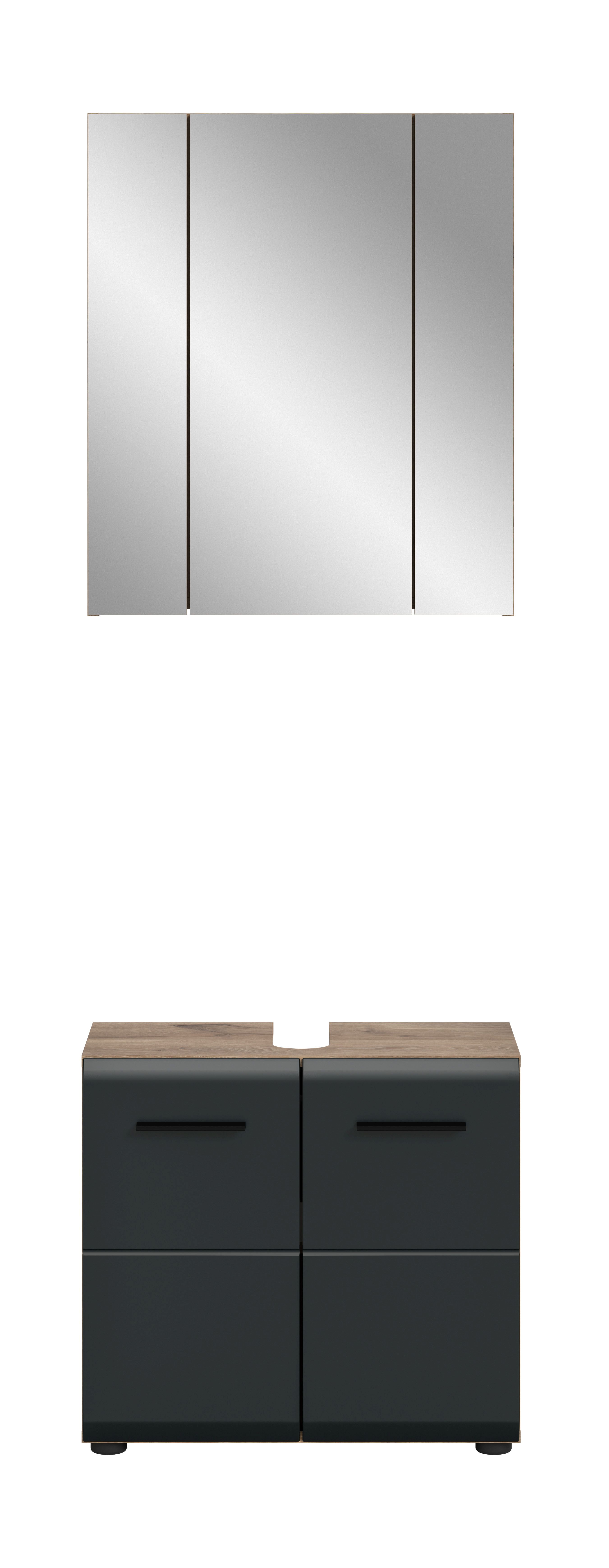 Entdecken Sie unsere elegante Badezimmer Badkombination in Schwarz matt und Nox Eiche Holznachbildung. Diese durchdachte Kombination aus verschiedenen Badmöbeln bietet nicht nur Stauraum für Ihre Badutensilien, sondern verleiht Ihrem Badezimmer auch einen modernen und aufgeräumten Look.