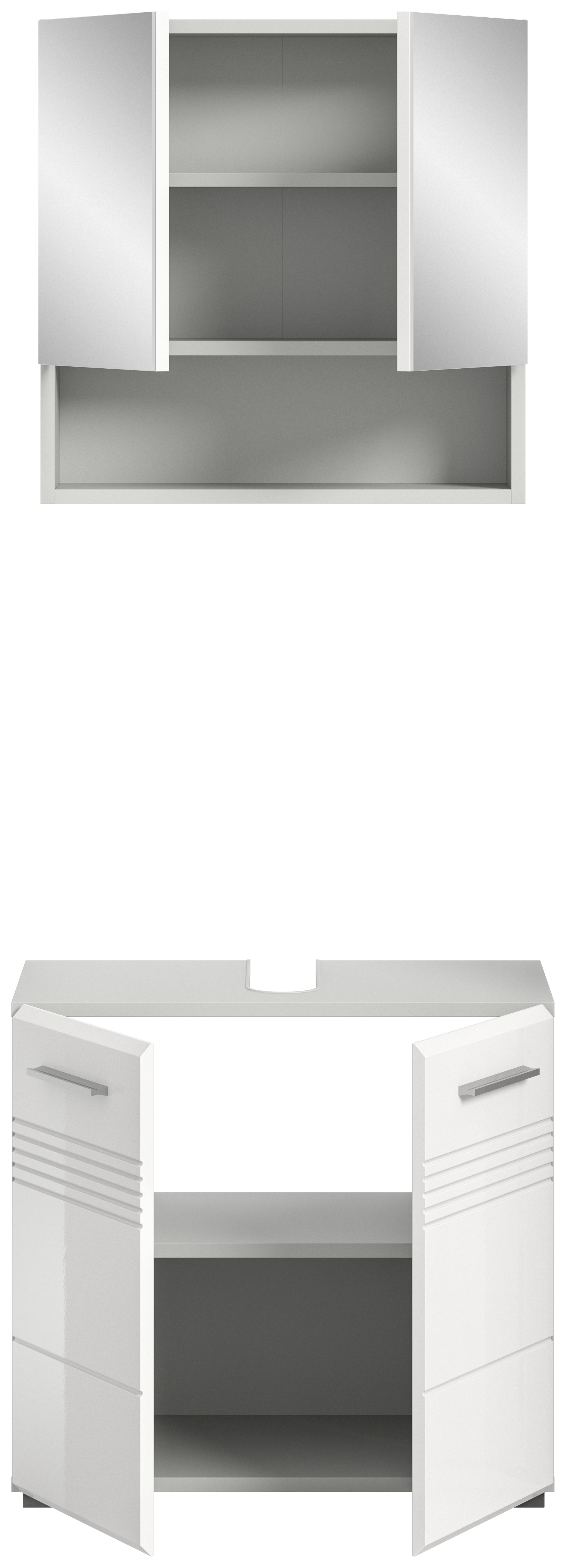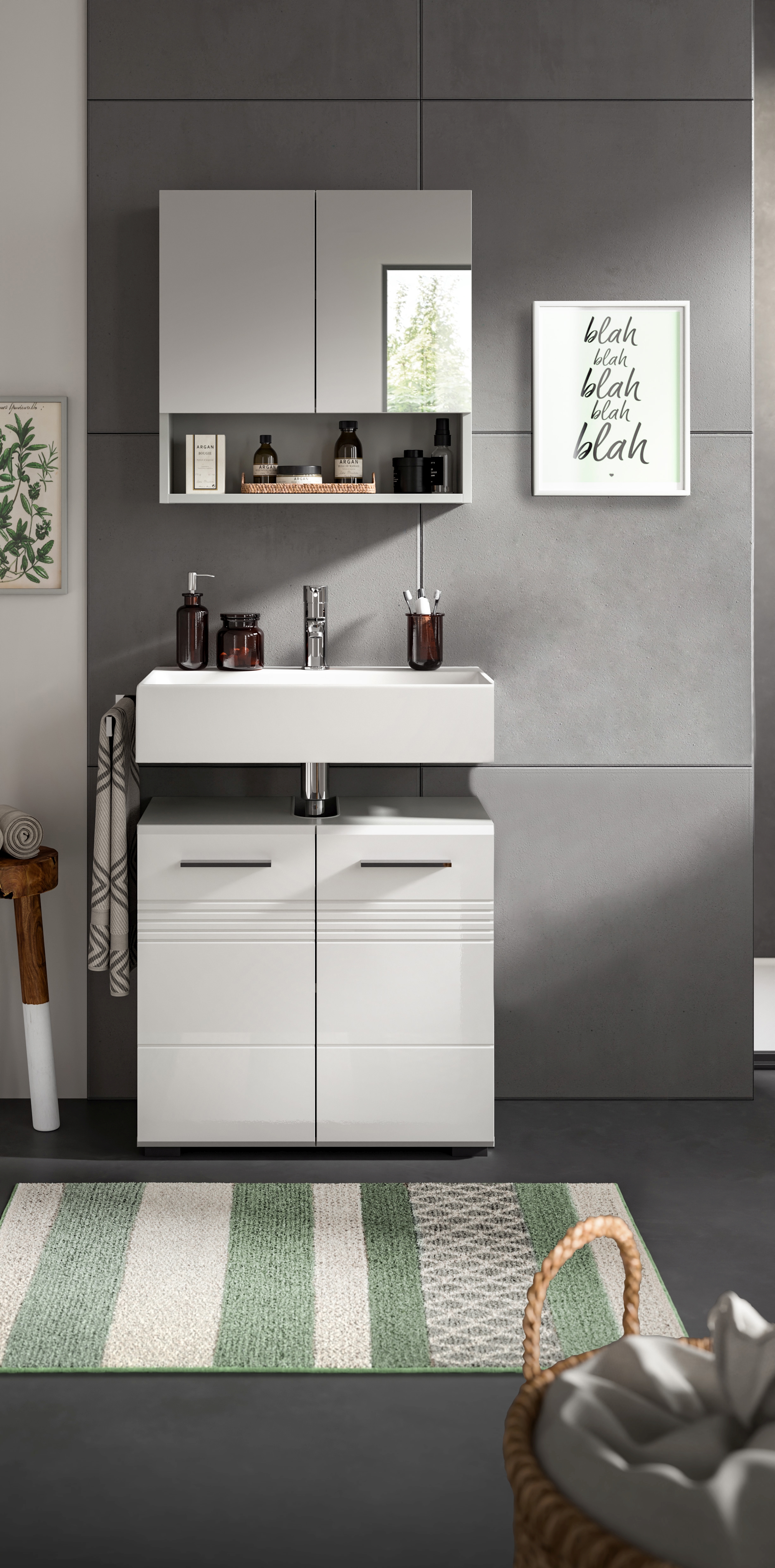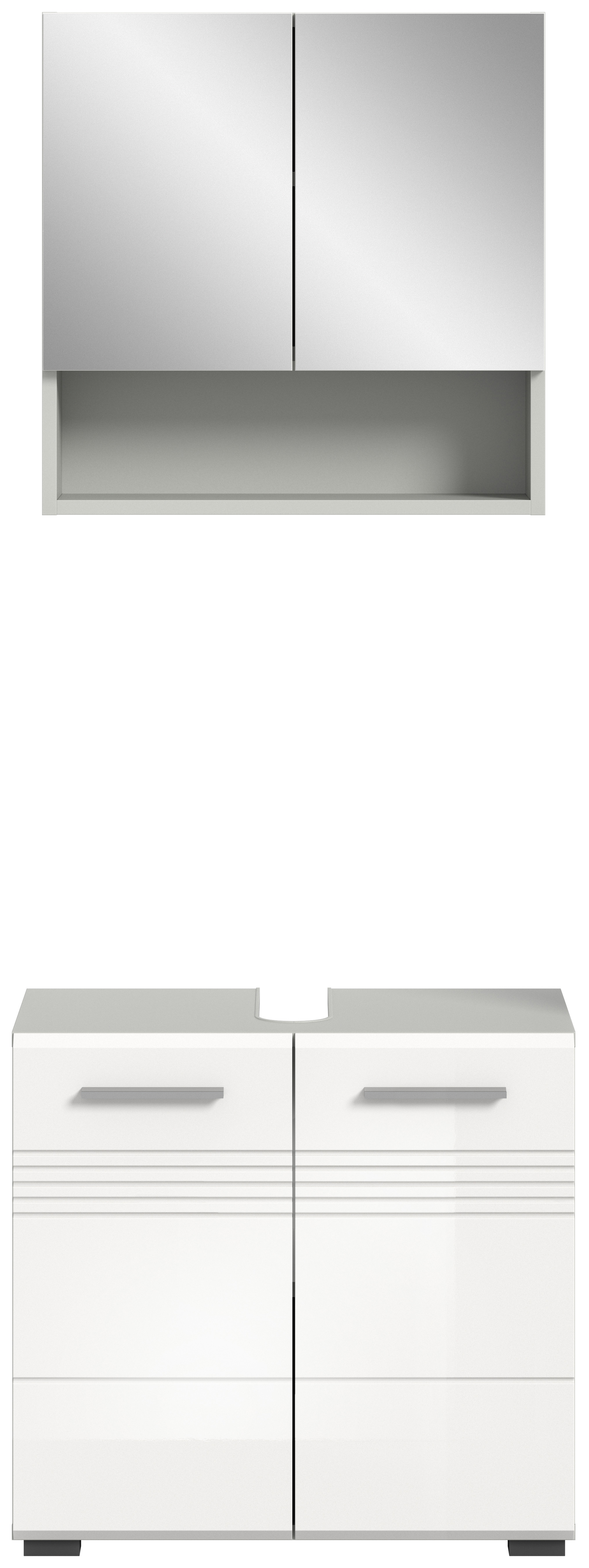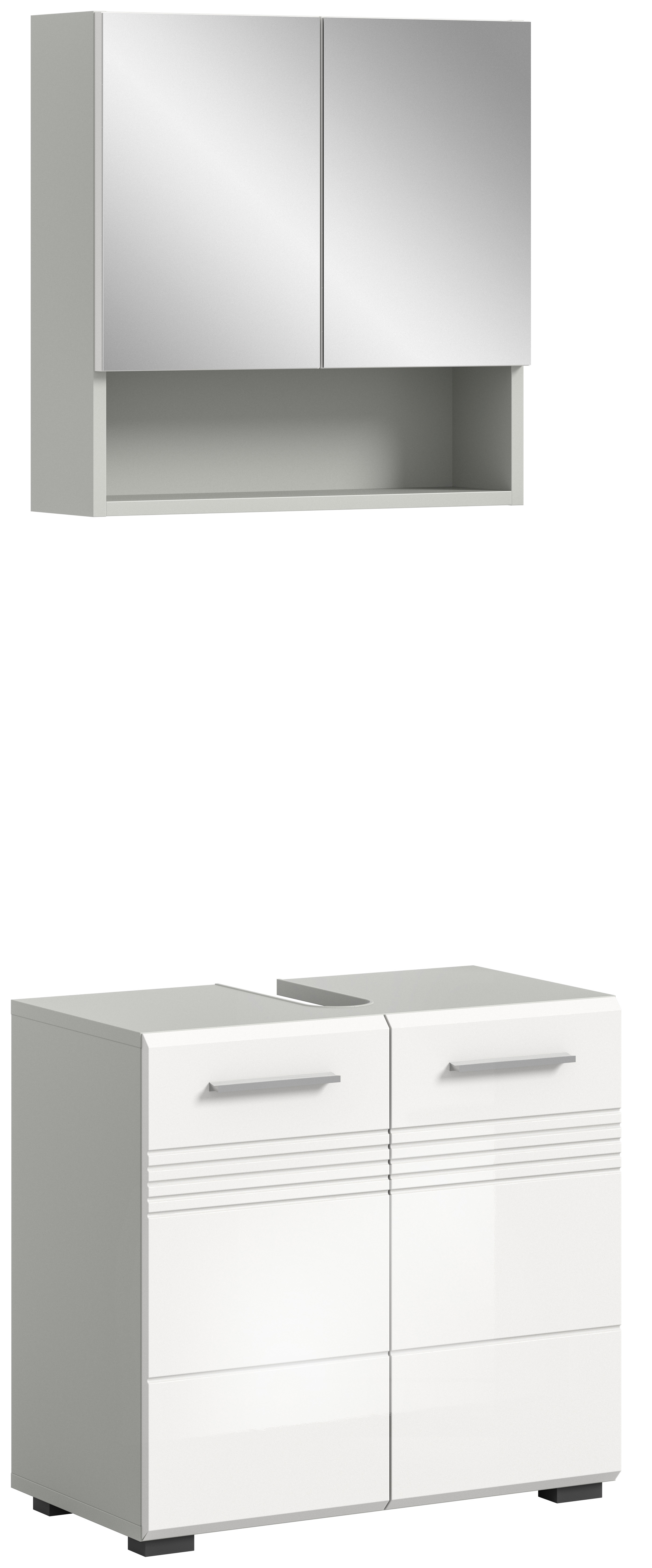 Entdecken Sie unsere moderne Badkombination in eleganter Hellgrau Nachbildung und strahlendem weißem Hochglanz, tiefgezogen für ein glänzendes Finish. Diese Kombination vereint Funktionalität und Stil und bietet mit ihrem zeitgemäßen Design eine perfekte Lösung für Ihr Badezimmer. Mit hochwertiger Verarbeitung und praktischem Stauraum ist sie die ideale Wahl für eine stilvolle und organisierte Badezimmereinrichtung.