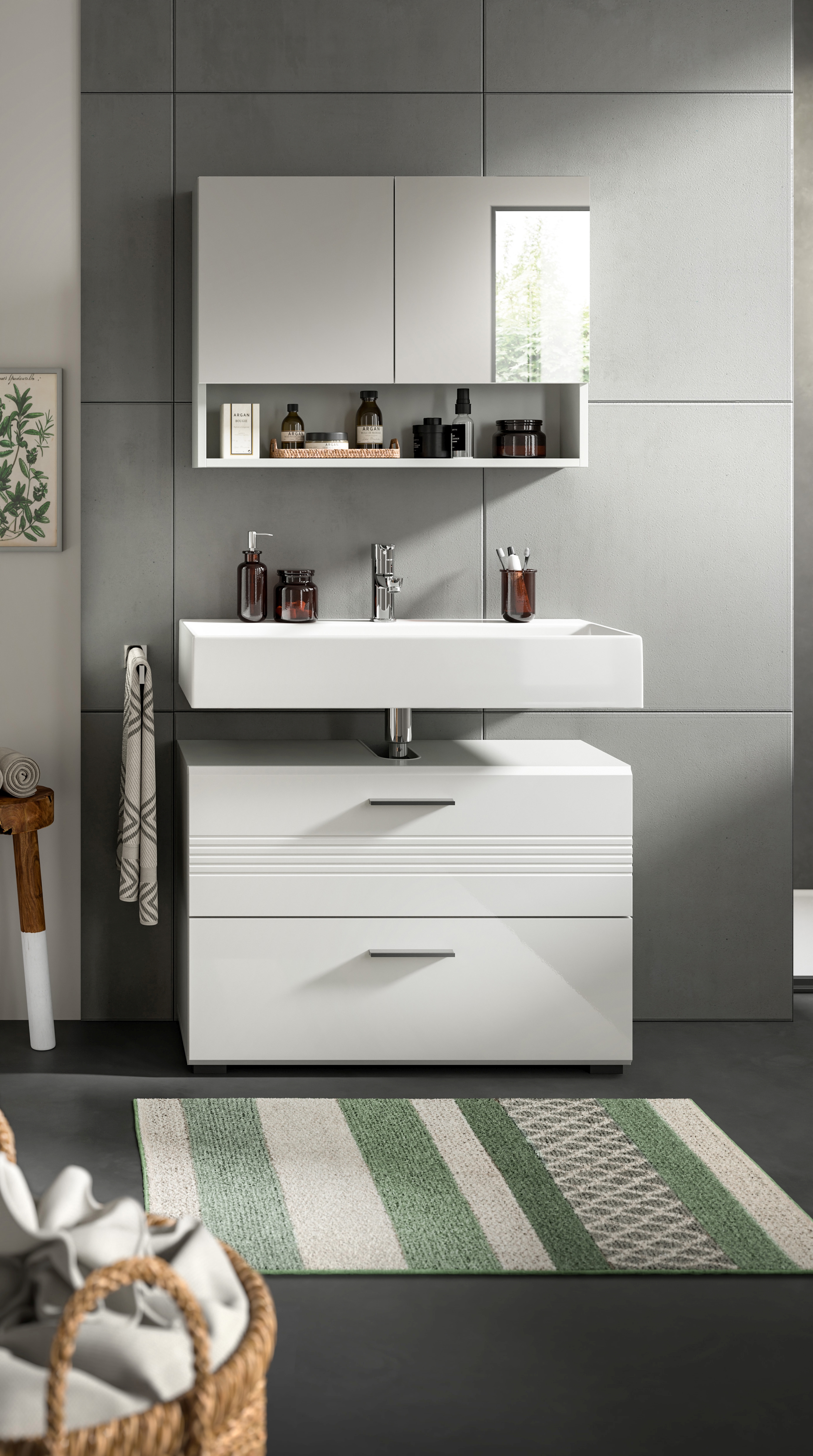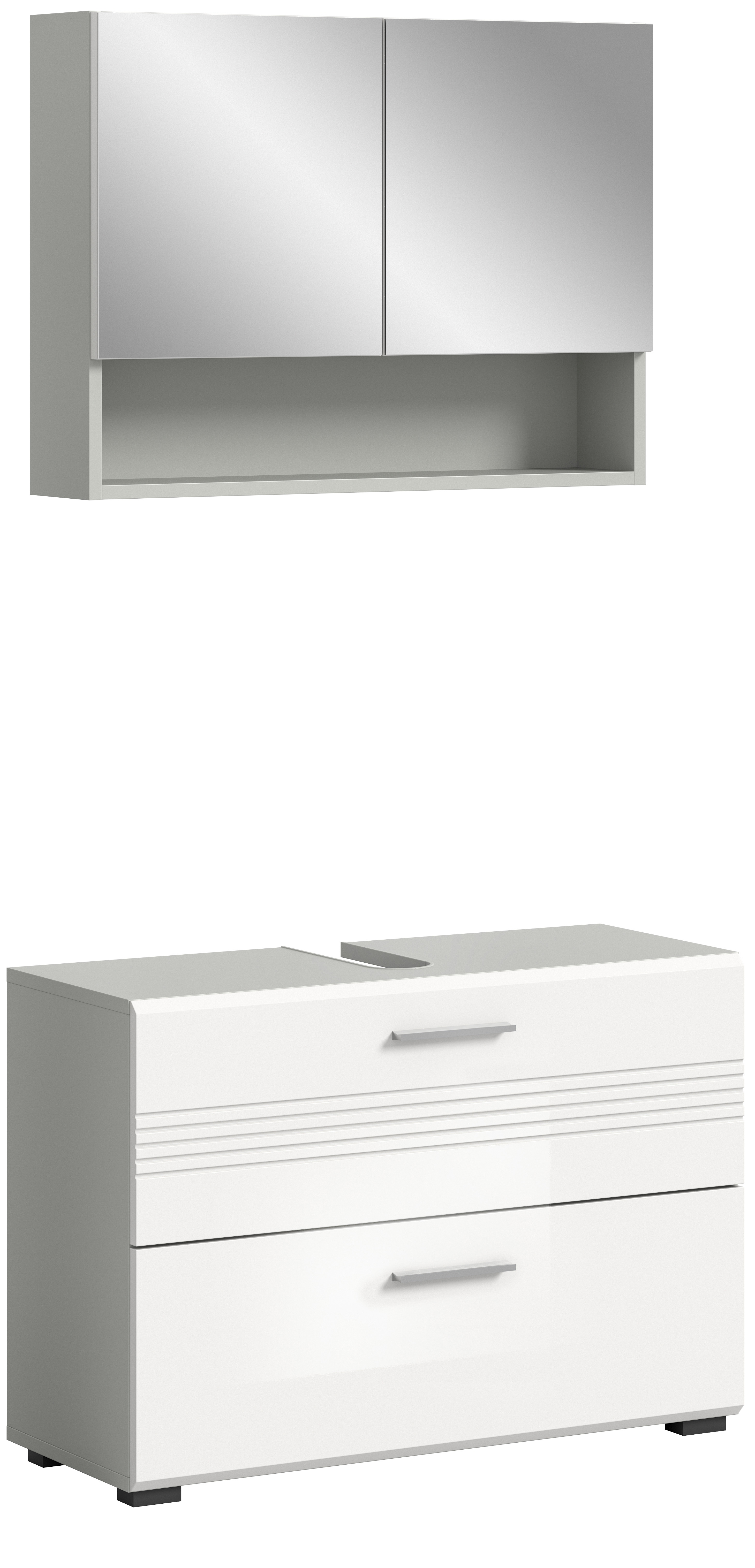 Entdecken Sie unsere moderne Badkombination in eleganter Hellgrau Nachbildung und strahlendem weißem Hochglanz, tiefgezogen für ein glänzendes Finish. Diese Kombination vereint Funktionalität und Stil und bietet mit ihrem zeitgemäßen Design eine perfekte Lösung für Ihr Badezimmer. Mit hochwertiger Verarbeitung und praktischem Stauraum ist sie die ideale Wahl für eine stilvolle und organisierte Badezimmereinrichtung.