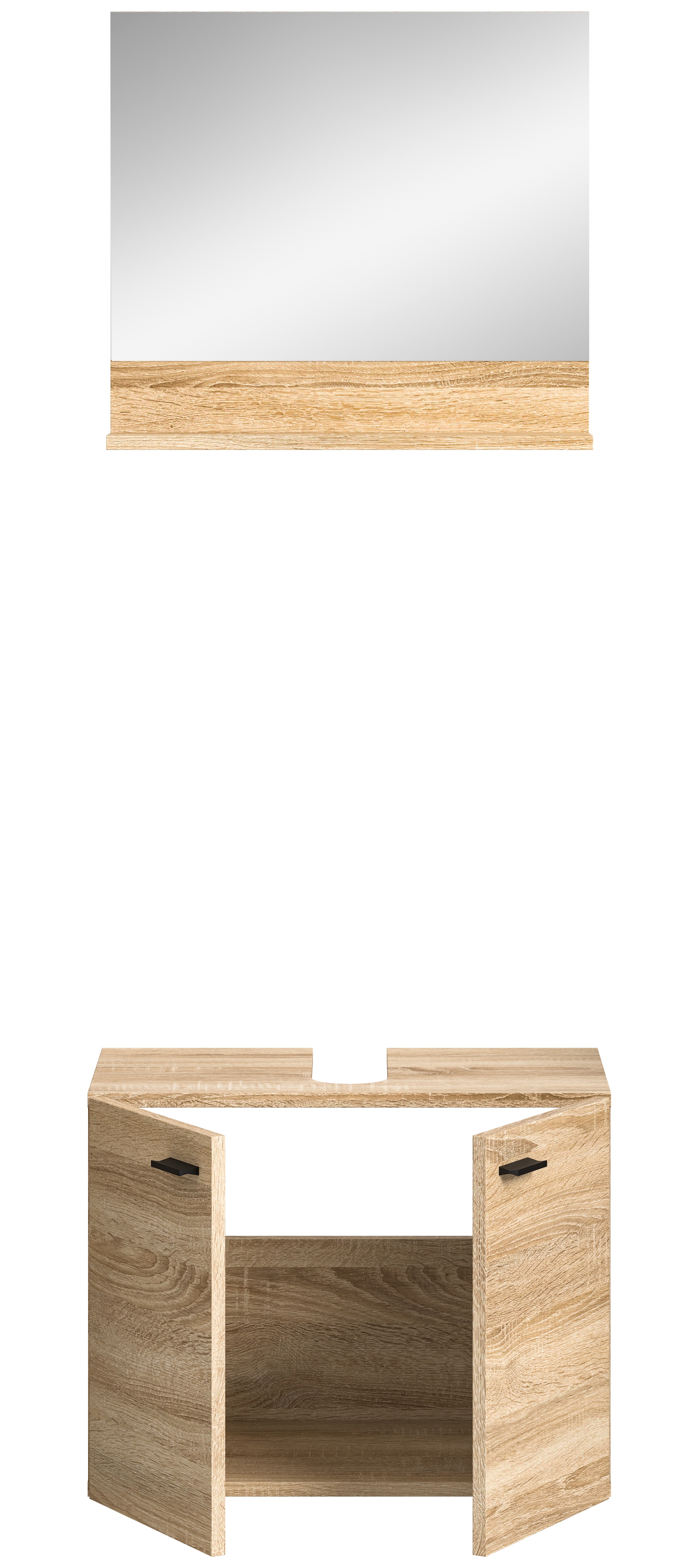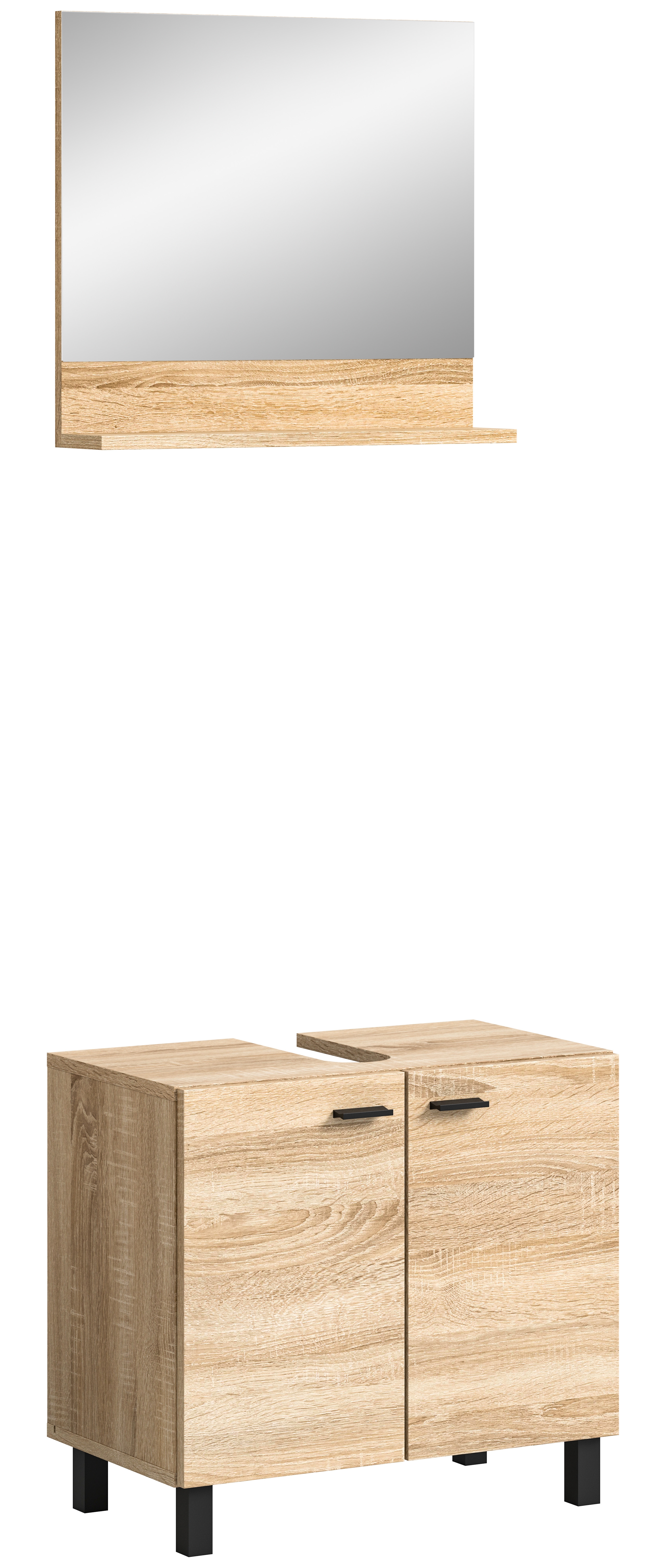- Design/Stil: Moderner Waschbeckenunterschrank mit passendem Spiegel in Eiche Sonoma Holznachbildung für ein sauberes und zeitgemäßes Erscheinungsbild im Badezimmer.