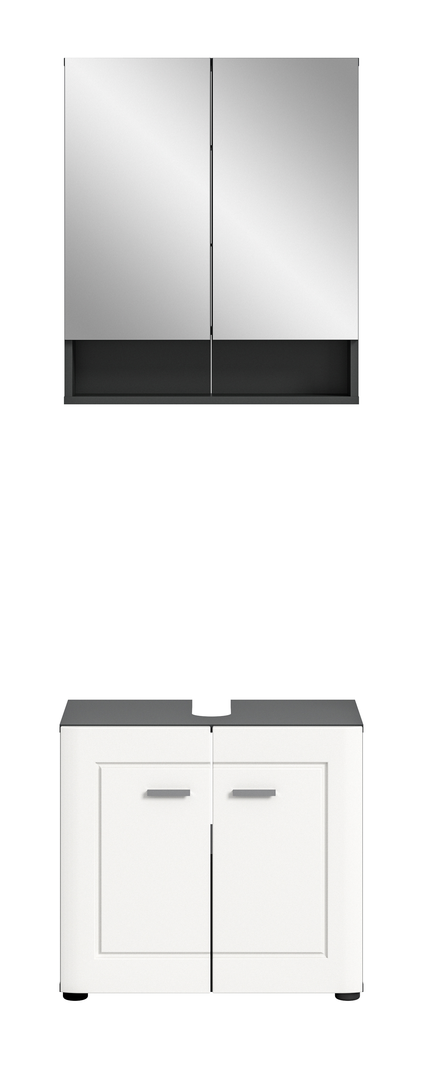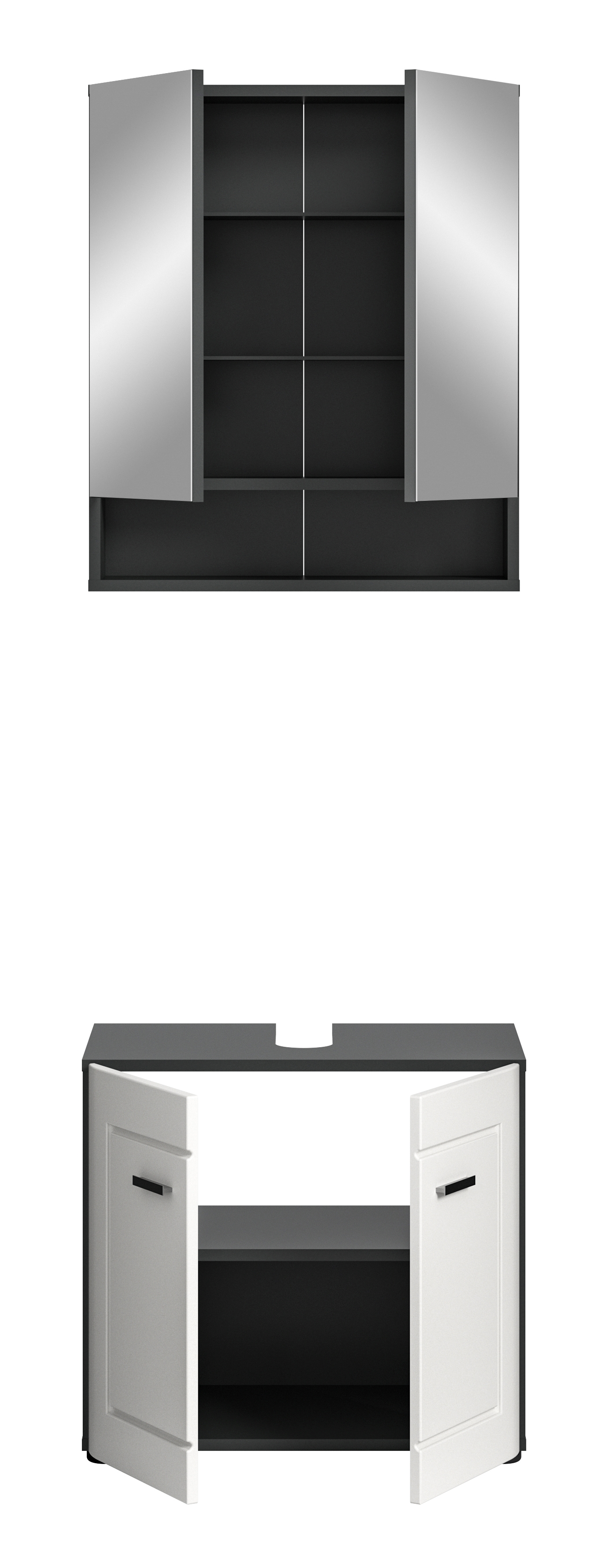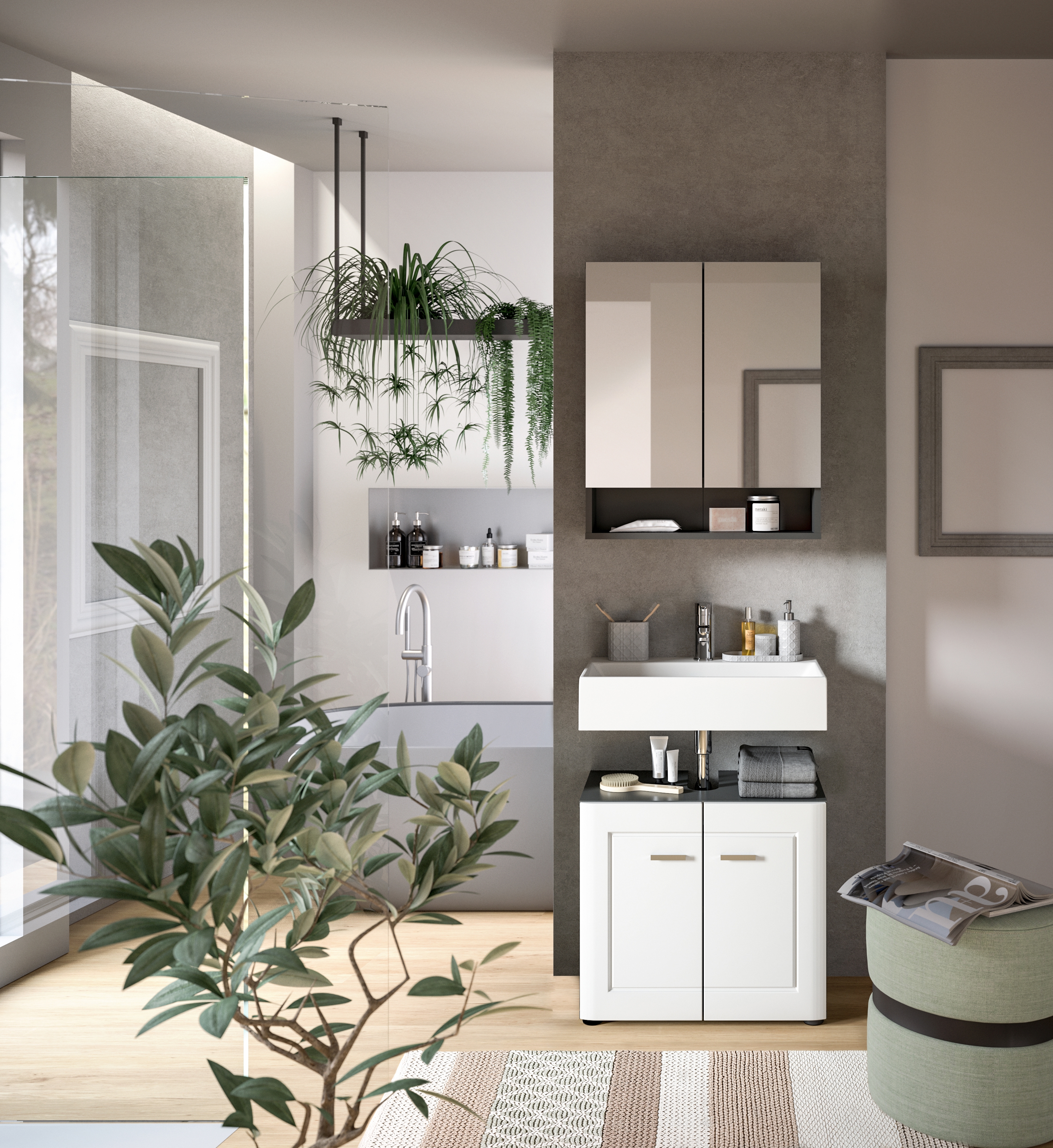 - Funktionalität: Umfassende Badkombination mit verschiedenen Elementen wie Waschbeckenunterschrank und Spiegelschrank für eine optimale Nutzung des vorhandenen Raums und eine effiziente Aufbewahrung von Badutensilien und Reinigungsprodukten.