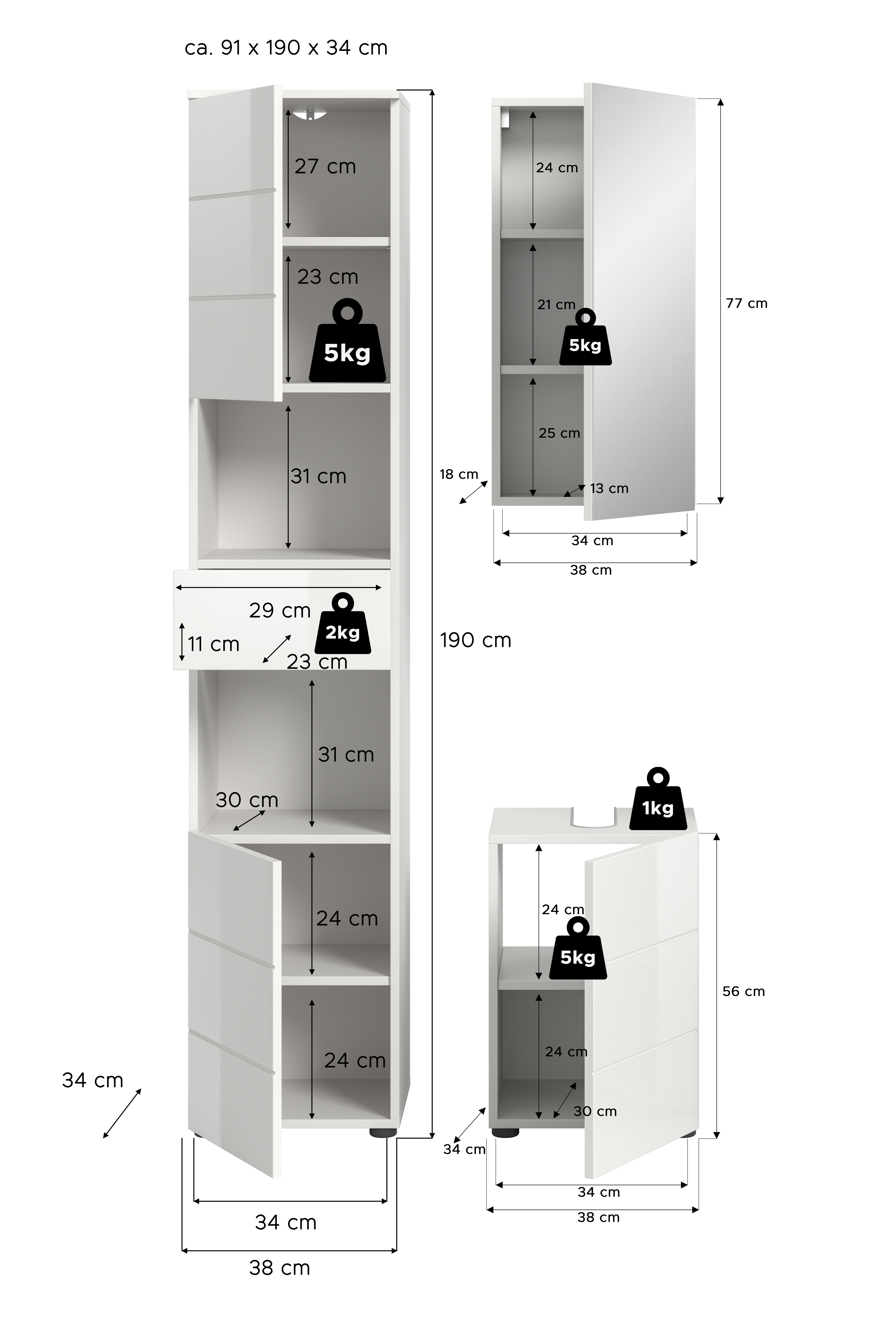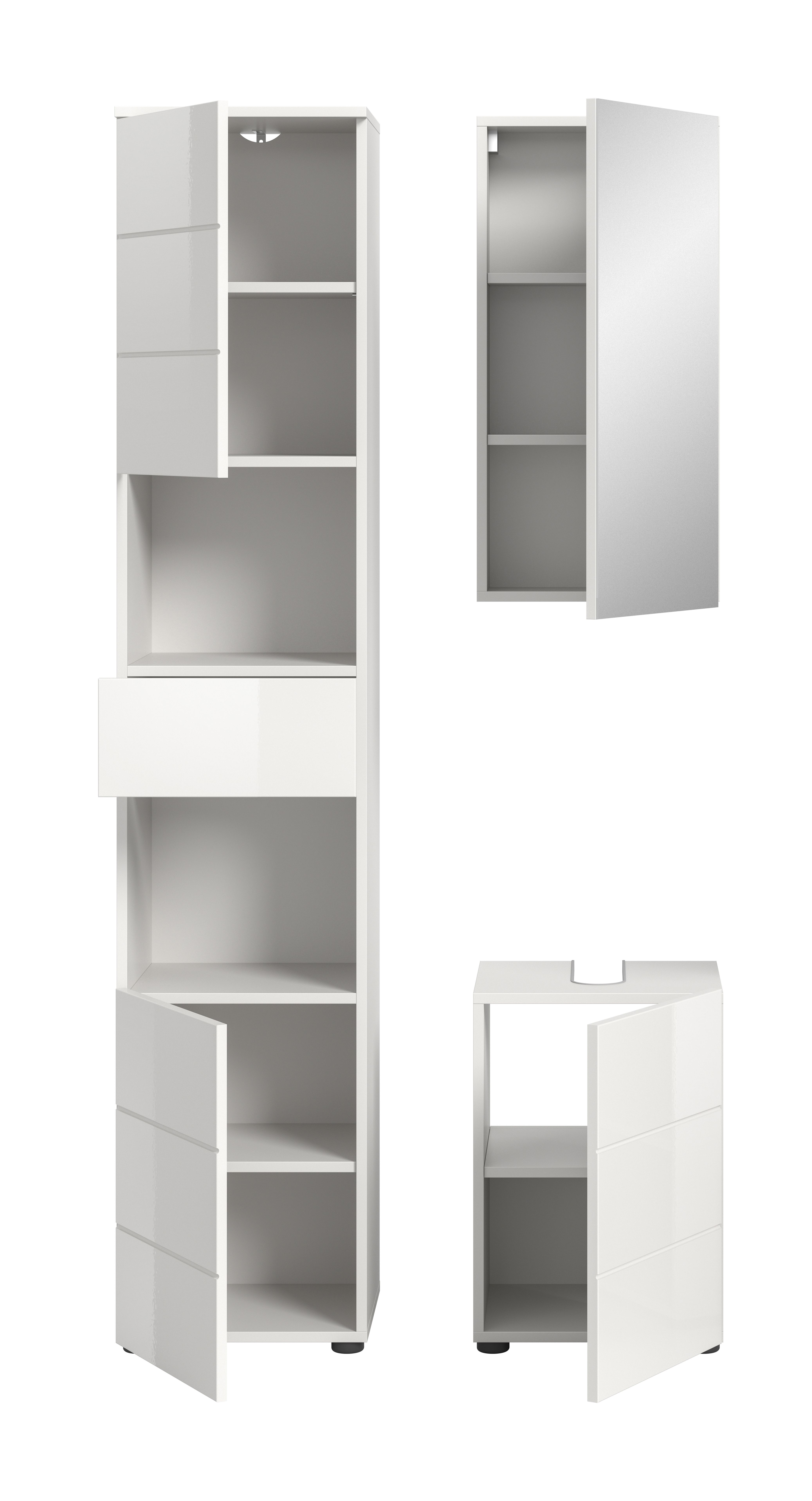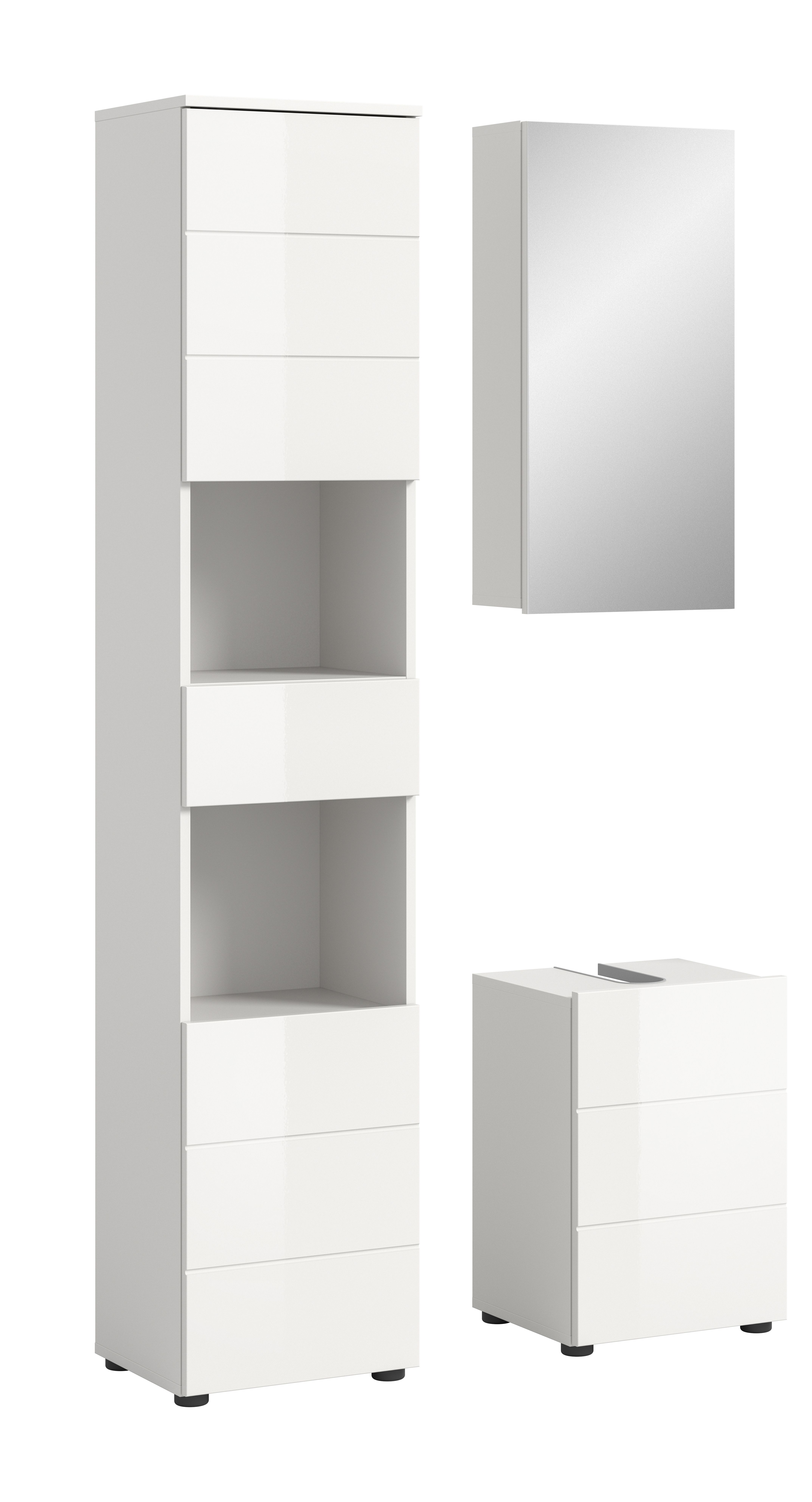 Die Badkombination (B/H/T: 91x190x34 cm) in weiß hochglänzender Tiefzieh-Optik ist ideal für kompakte Badezimmer. Diese Kombination umfasst einen Hochschrank, einen Waschbeckenunterschrank und einen Spiegelschrank, die zusammen eine praktische und stilvolle Lösung für Ihre Badutensilien bieten. Genießen Sie ein modernes Erscheinungsbild und zusätzlichen Stauraum, während Sie Ihr Badezimmer auf einfache Weise organisieren!