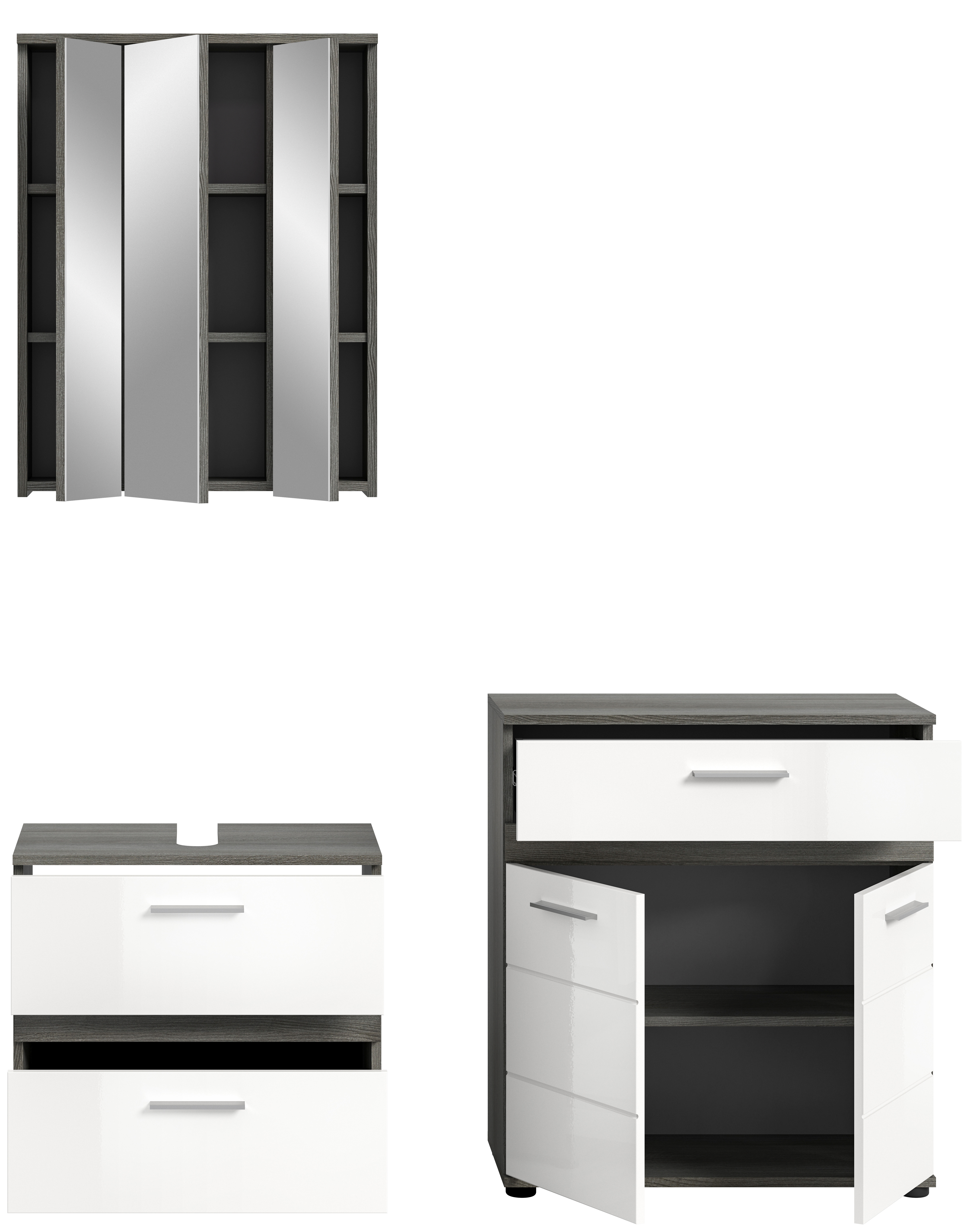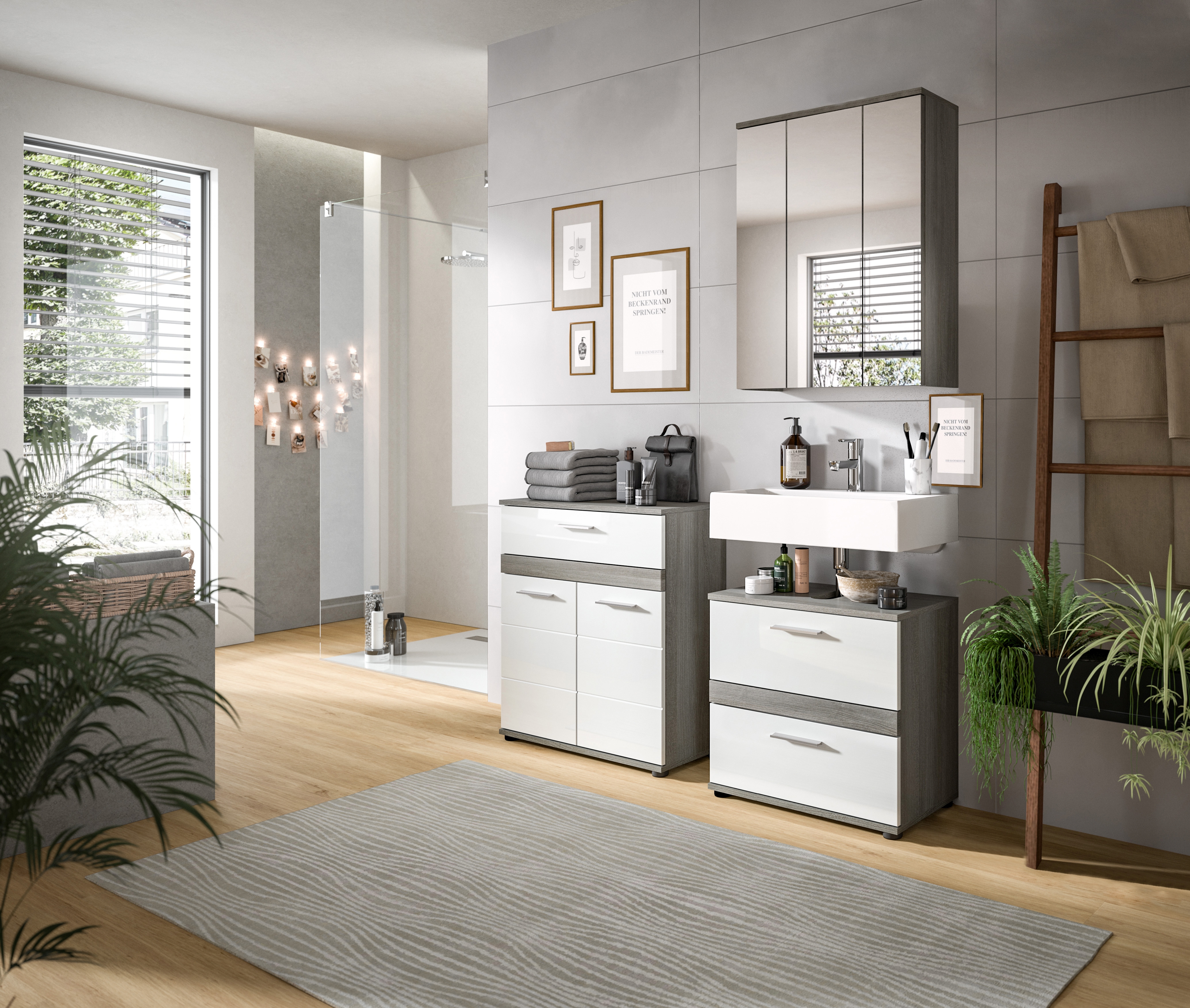 Unsere Badkombination vereint Stil und Funktionalität in einem eleganten Design. Die Rauchsilber-Nachbildung in Kombination mit dem strahlenden Weiß-Hochglanz verleiht Ihrem Badezimmer einen modernen und attraktiven Look. Entdecken Sie jetzt diese vielseitige Lösung für Ihr Bad und verwandeln Sie Ihren Raum in eine stilvolle Wohlfühloase.