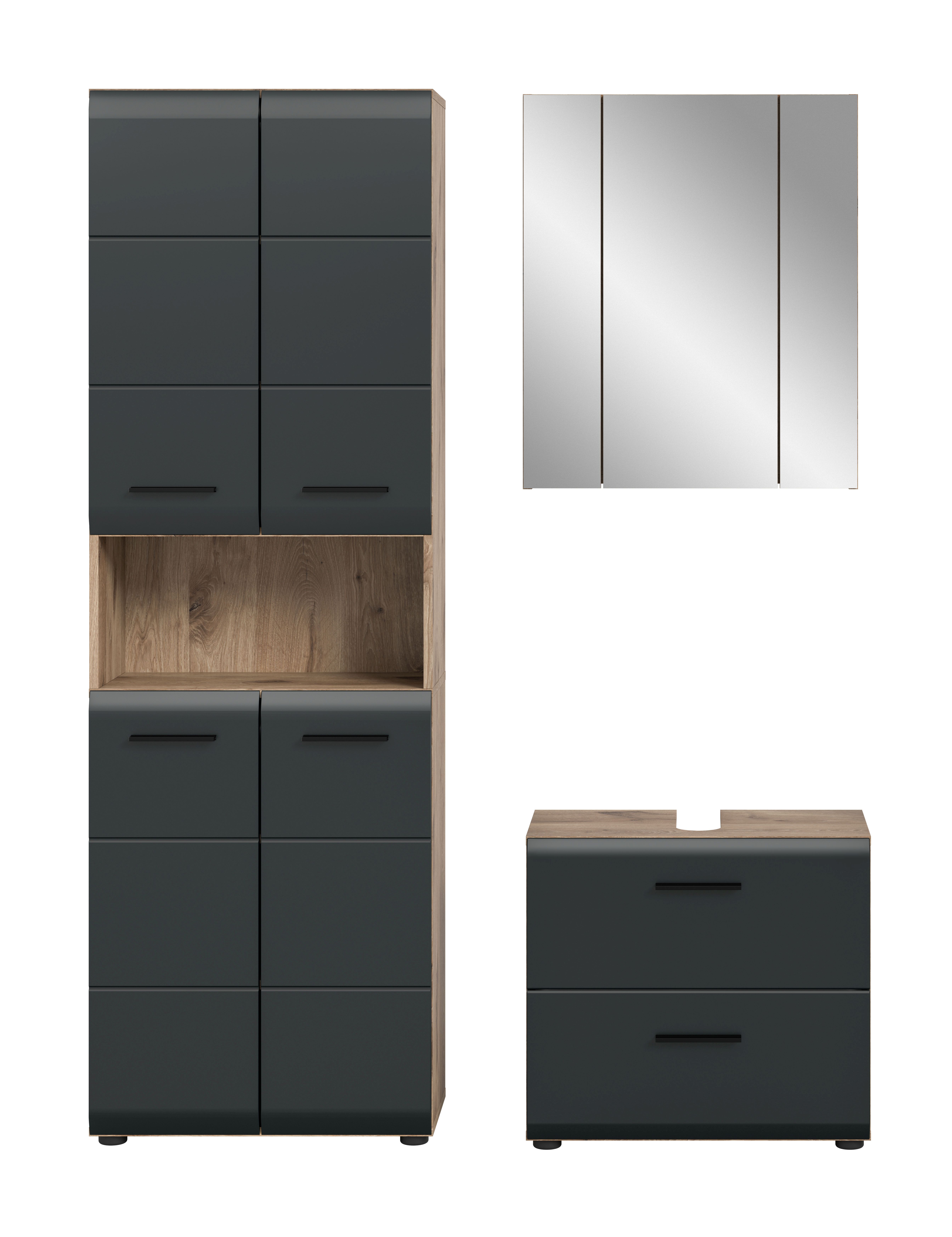Entdecken Sie unsere elegante Badezimmer Badkombination in Schwarz matt und Nox Eiche Holznachbildung. Diese durchdachte Kombination aus verschiedenen Badmöbeln bietet nicht nur Stauraum für Ihre Badutensilien, sondern verleiht Ihrem Badezimmer auch einen modernen und aufgeräumten Look.
