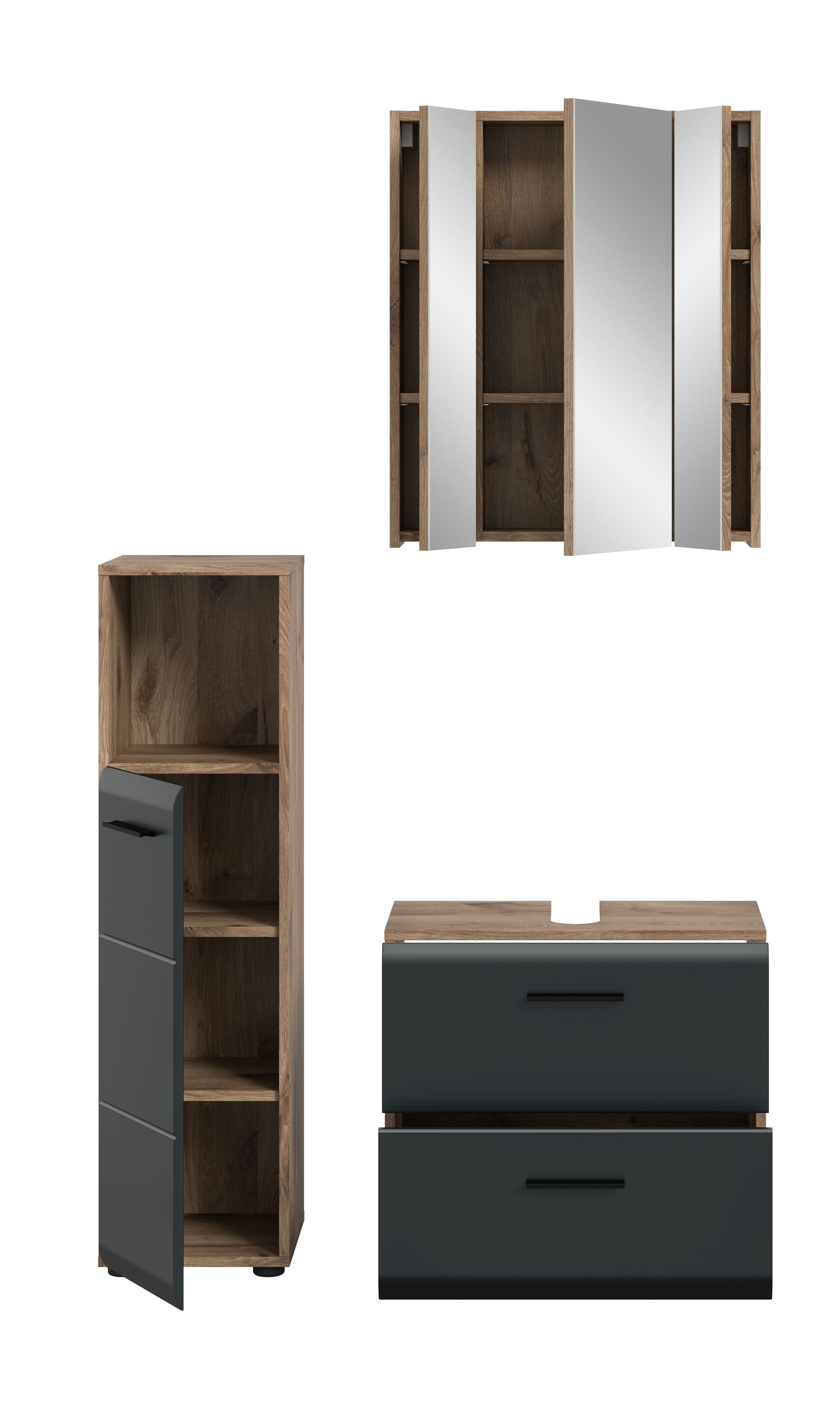 Entdecken Sie unsere elegante Badezimmer Badkombination in Schwarz matt und Nox Eiche Holznachbildung. Diese durchdachte Kombination aus verschiedenen Badmöbeln in bietet nicht nur Stauraum für Ihre Badutensilien, sondern verleiht Ihrem Badezimmer auch einen modernen und aufgeräumten Look.