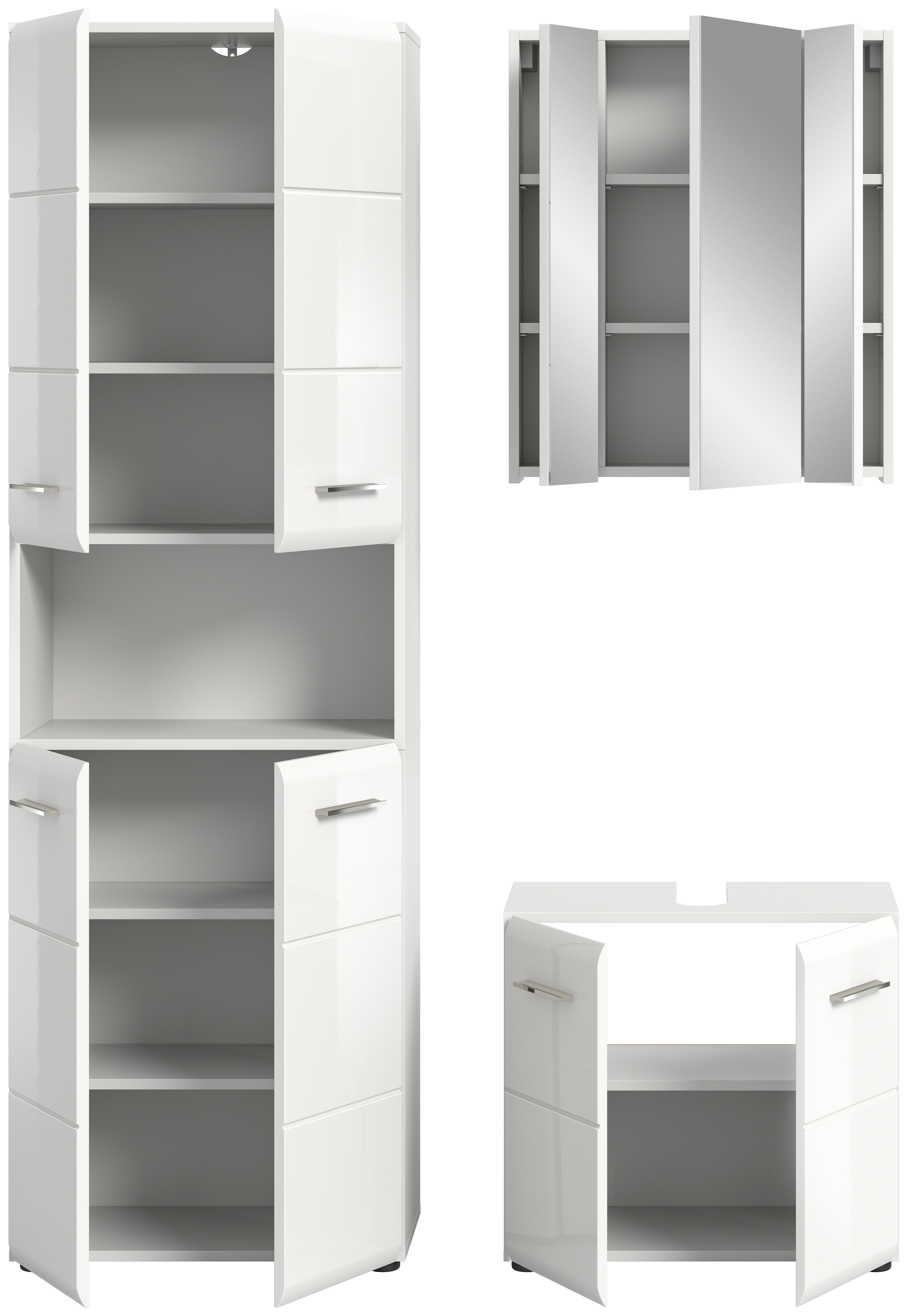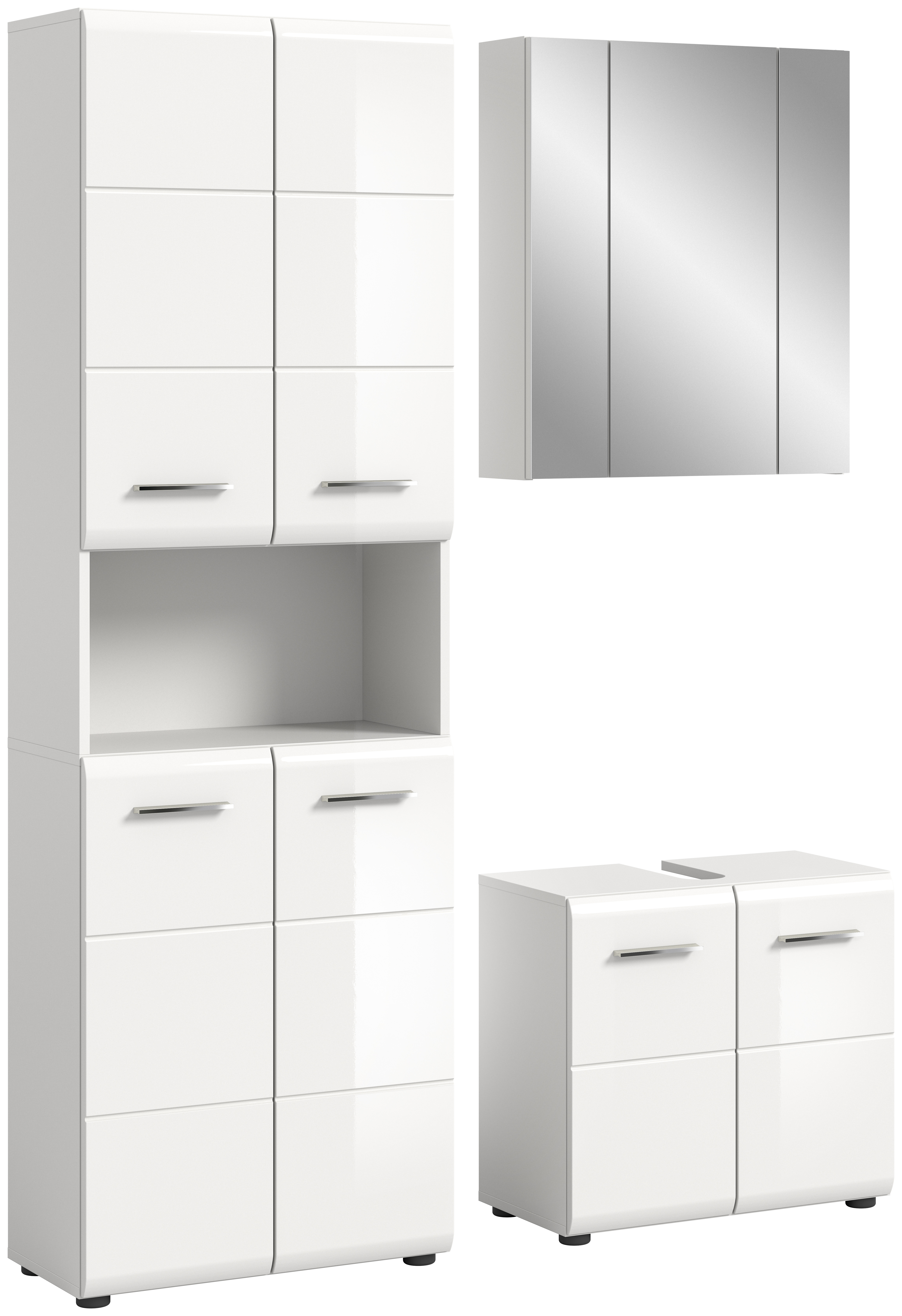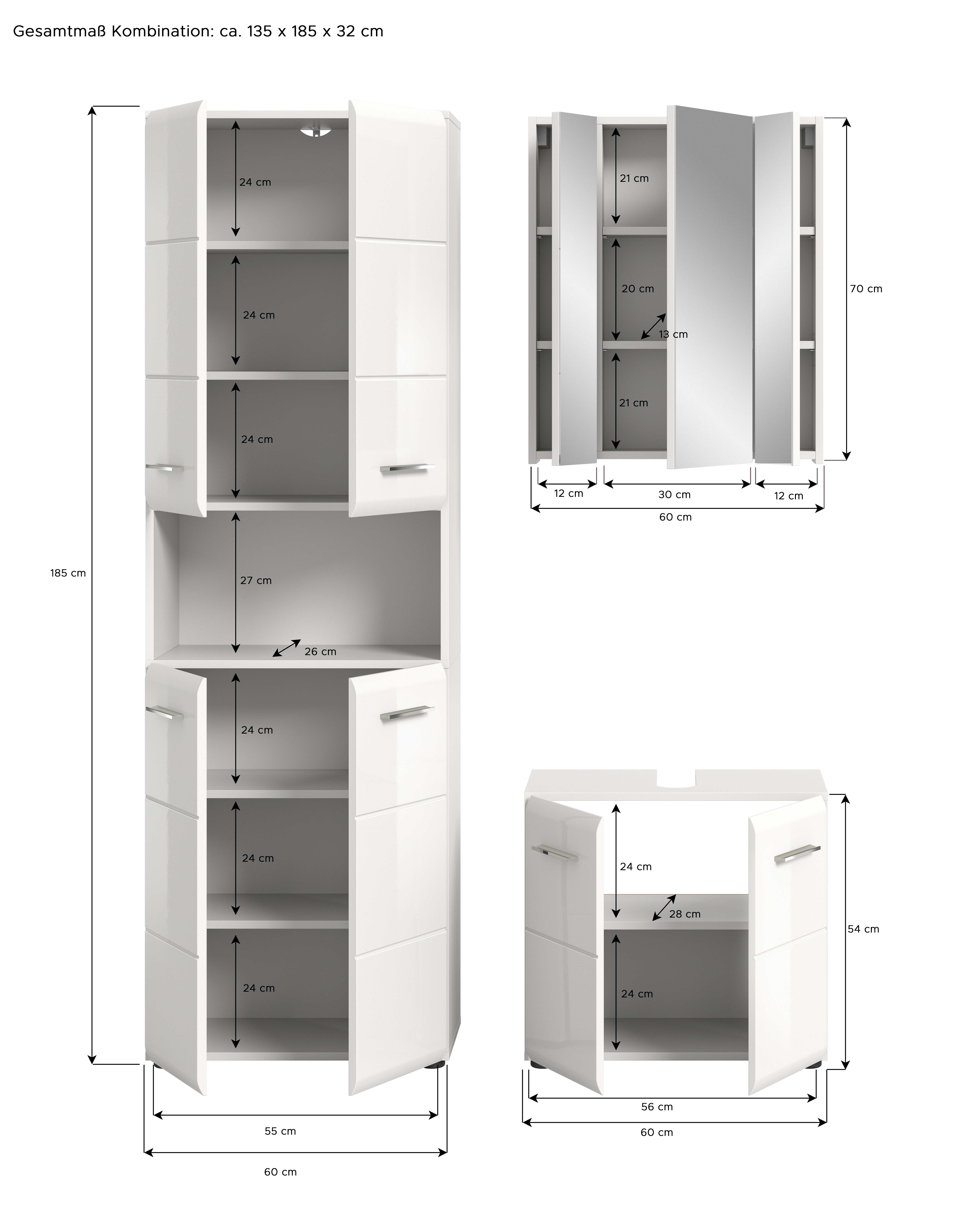 Entdecken Sie unsere elegante Badezimmer Badkombination in strahlendem Weiß, vereint mit hochglänzenden tiefgezogenen Elementen für zeitlose Eleganz. Diese durchdachte Kombination aus verschiedenen Badmöbeln in Weiß-Nachbildung bietet nicht nur Stauraum für Ihre Badutensilien, sondern verleiht Ihrem Badezimmer auch einen modernen und aufgeräumten Look.