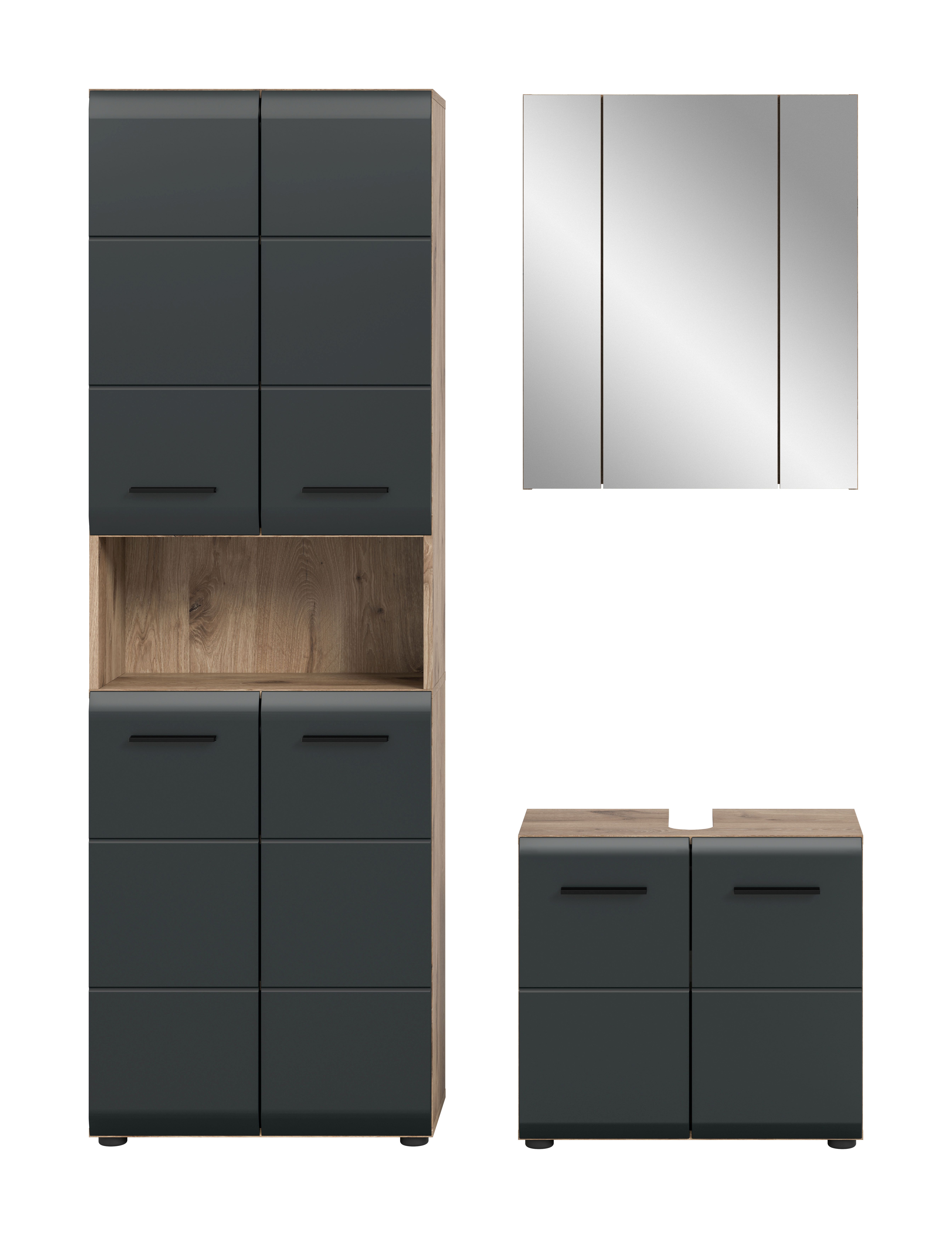 Entdecken Sie unsere elegante Badezimmer Badkombination in Schwarz matt und Nox Eiche Holznachbildung. Diese durchdachte Kombination aus verschiedenen Badmöbeln bietet nicht nur Stauraum für Ihre Badutensilien, sondern verleiht Ihrem Badezimmer auch einen modernen und aufgeräumten Look.