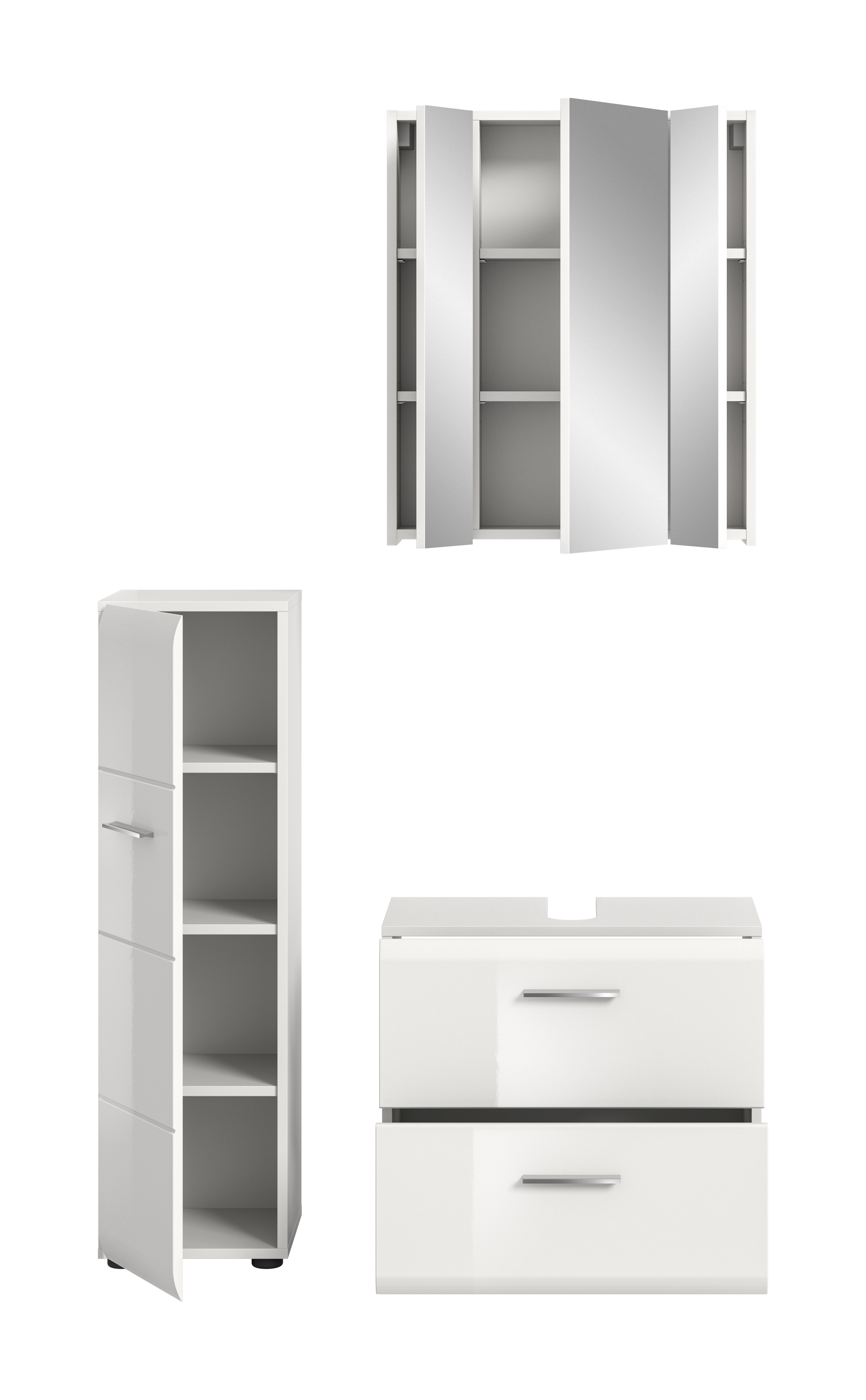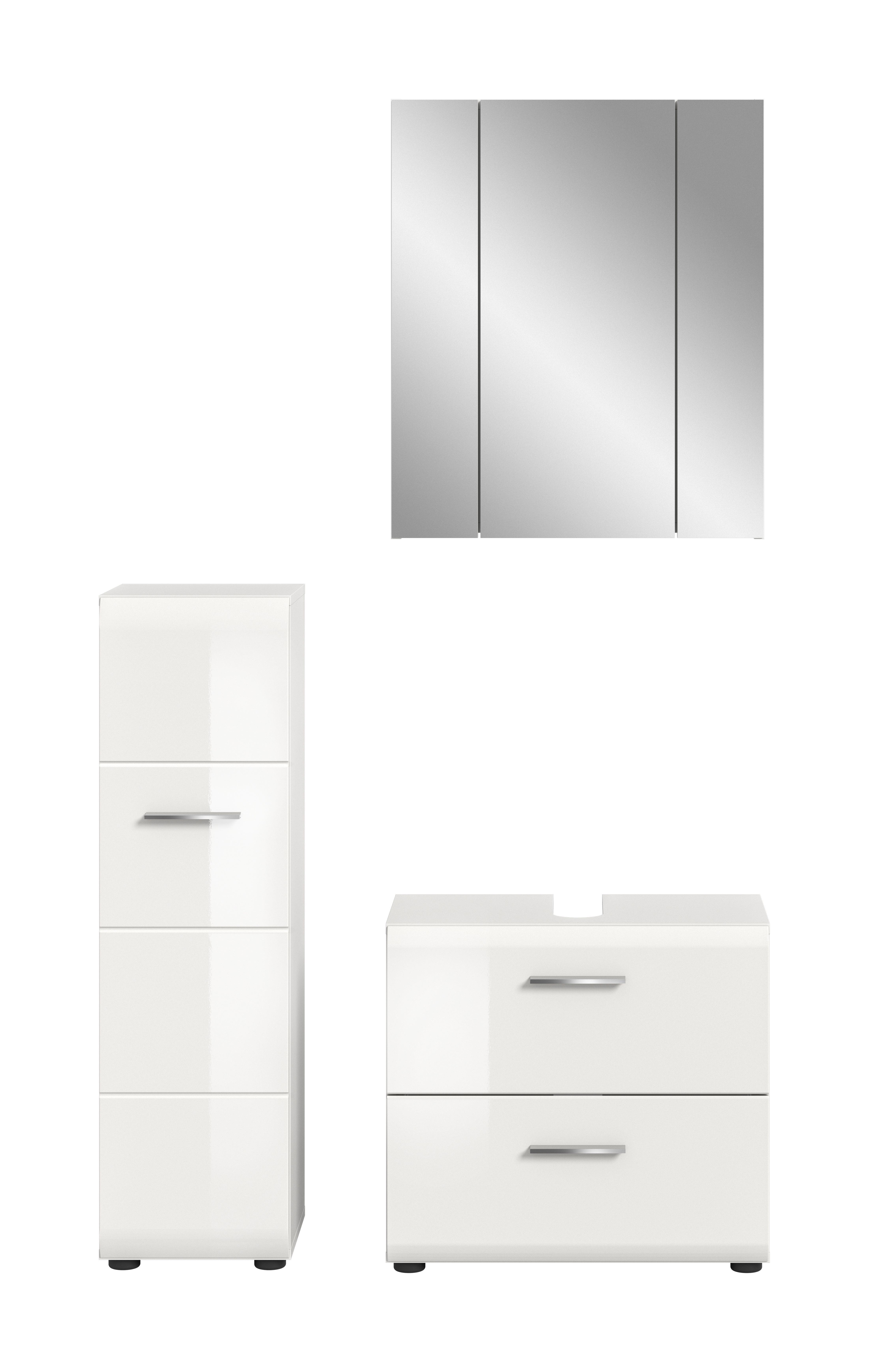 Entdecken Sie unsere elegante Badezimmer Badkombination in strahlendem Weiß, vereint mit hochglänzenden tiefgezogenen Elementen für zeitlose Eleganz. Diese durchdachte Kombination aus verschiedenen Badmöbeln in Weiß-Nachbildung bietet nicht nur Stauraum für Ihre Badutensilien, sondern verleiht Ihrem Badezimmer auch einen modernen und aufgeräumten Look.