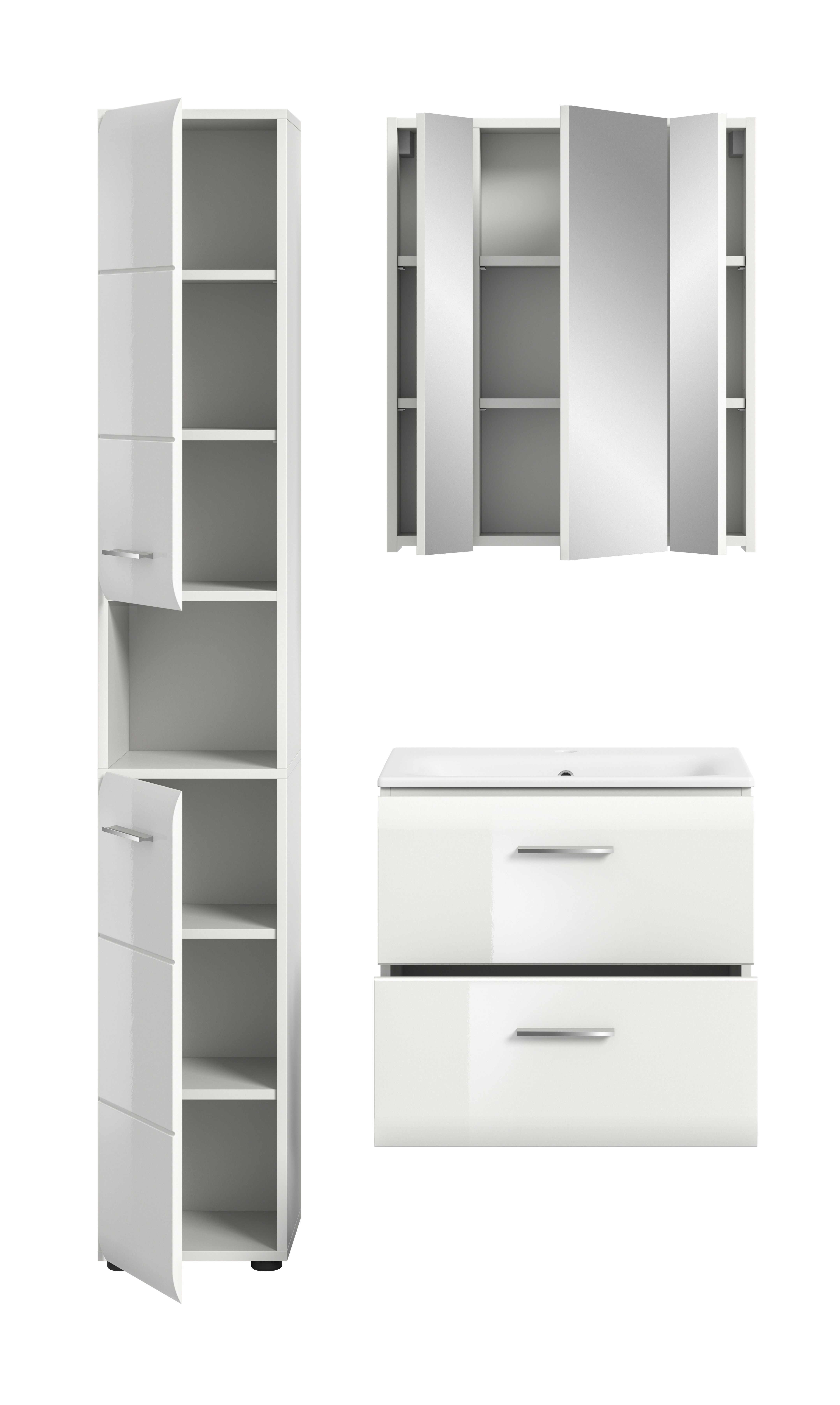 Verleihen Sie Ihrem Badezimmer mit unserer eleganten 3-teiligen Badkombination neuen Glanz! Diese durchdachte Kombination umfasst einen geräumigen Hochschrank, einen funktionalen Waschtisch inklusive Waschbecken und einen stilvollen Spiegelschrank, die Ihnen eine optimale Nutzung des verfügbaren Platzes ermöglichen. Mit den Abmessungen von 105 x 185 x 46 cm und einem Typenabstand von 15 cm bietet diese Badkombination ausreichend Stauraum für all Ihre Badutensilien. Die hochwertige MDF-Front mit moderner Rillenfräsung verleiht Ihrem Badezimmer nicht nur eine zeitgemäße Ästhetik, sondern sorgt auch für Langlebigkeit und einfache Pflege. Jedes Element ist darauf ausgelegt, sowohl Funktionalität als auch Stil zu gewährleisten. Ein sauberer und aufgeräumter Look, kombiniert mit einem modernen Design, macht diese Badkombination zur idealen Wahl für jedes Badezimmer. Genießen Sie die perfekte Symbiose aus platzsparenden Lösungen und ansprechendem Design – machen Sie Ihr Badezimmer zu einem Ort der Entspannung und des Wohlbefindens!