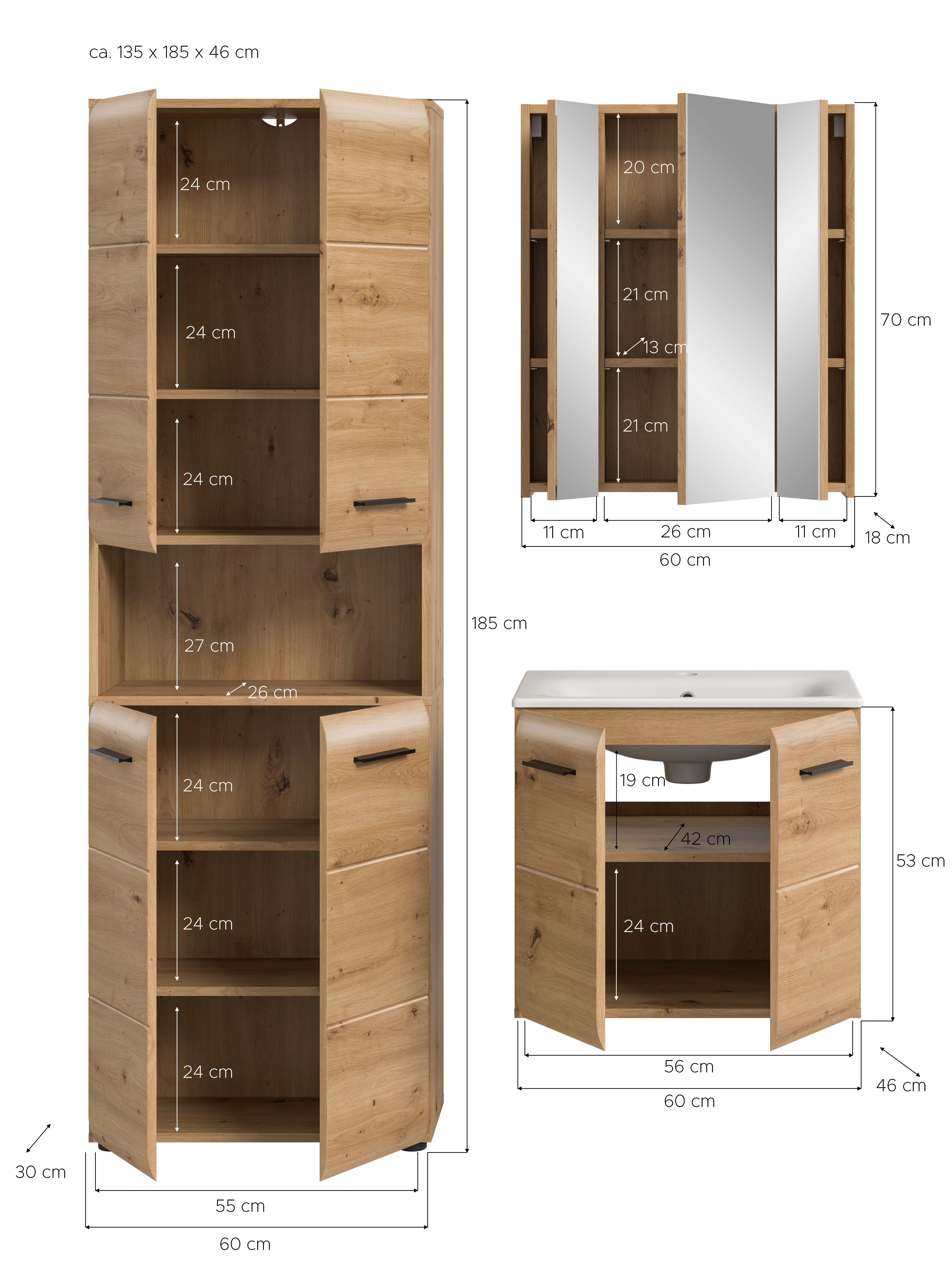 Verleihen Sie Ihrem Badezimmer mit unserer eleganten 3-teiligen Badkombination neuen Glanz! Diese durchdachte Kombination umfasst einen geräumigen Hochschrank, einen funktionalen Waschtisch inklusive Waschbecken und einen stilvollen Spiegelschrank, die Ihnen eine optimale Nutzung des verfügbaren Platzes ermöglichen. Mit den Abmessungen von 135 x 185 x 46 cm und einem Typenabstand von 15 cm bietet diese Badkombination ausreichend Stauraum für all Ihre Badutensilien. Die hochwertige MDF-Front mit moderner Rillenfräsung verleiht Ihrem Badezimmer nicht nur eine zeitgemäße Ästhetik, sondern sorgt auch für Langlebigkeit und einfache Pflege. Jedes Element ist darauf ausgelegt, sowohl Funktionalität als auch Stil zu gewährleisten. Ein sauberer und aufgeräumter Look, kombiniert mit einem modernen Design, macht diese Badkombination zur idealen Wahl für jedes Badezimmer. Genießen Sie die perfekte Symbiose aus platzsparenden Lösungen und ansprechendem Design – machen Sie Ihr Badezimmer zu einem Ort der Entspannung und des Wohlbefindens!