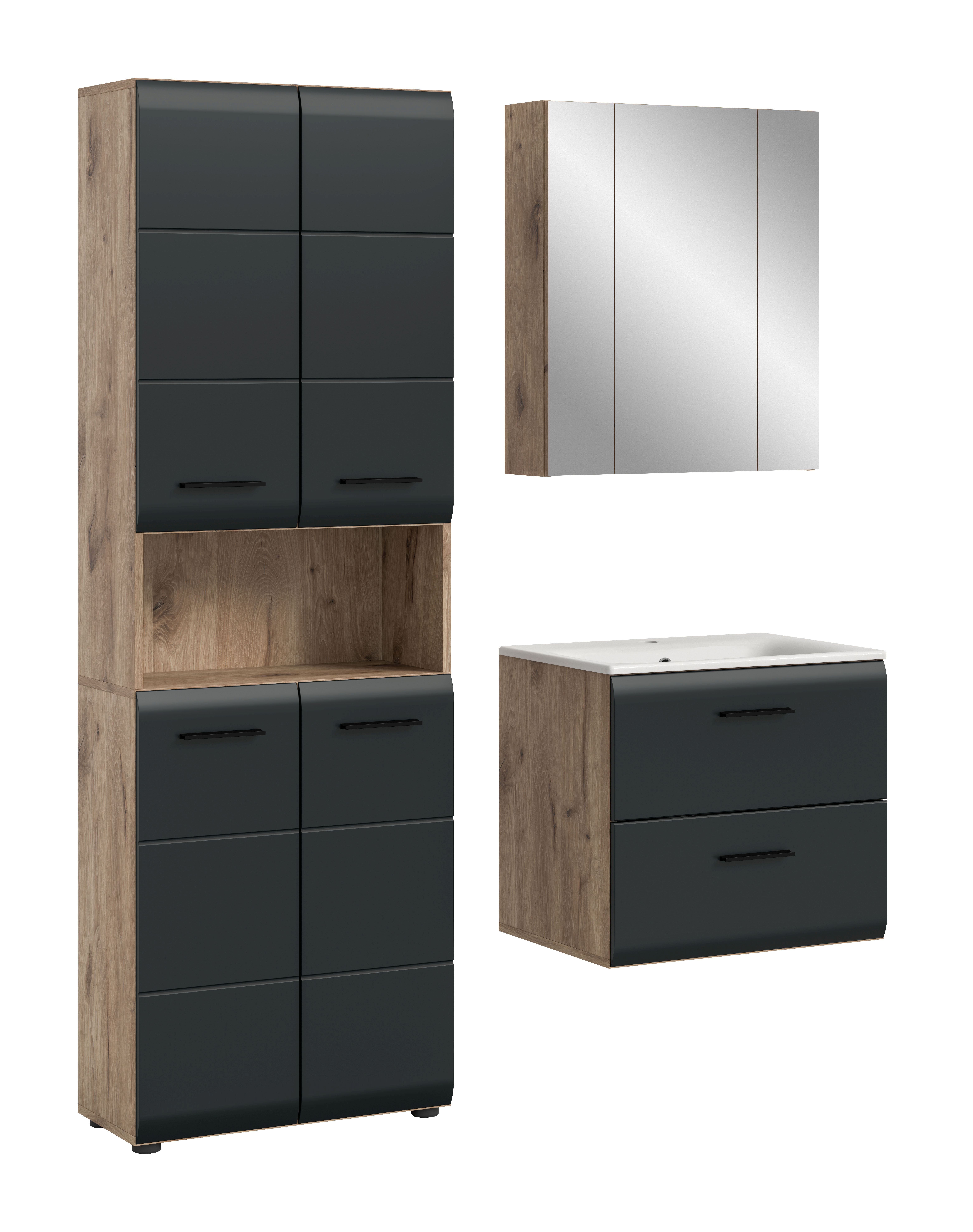 Verleihen Sie Ihrem Badezimmer mit unserer eleganten 3-teiligen Badkombination neuen Glanz! Diese durchdachte Kombination umfasst einen geräumigen Hochschrank, einen funktionalen Waschtisch inklusive Waschbecken und einen stilvollen Spiegelschrank, die Ihnen eine optimale Nutzung des verfügbaren Platzes ermöglichen. Mit den Abmessungen von 135 x 185 x 46 cm und einem Typenabstand von 15 cm bietet diese Badkombination ausreichend Stauraum für all Ihre Badutensilien. Die hochwertige MDF-Front mit moderner Rillenfräsung verleiht Ihrem Badezimmer nicht nur eine zeitgemäße Ästhetik, sondern sorgt auch für Langlebigkeit und einfache Pflege. Jedes Element ist darauf ausgelegt, sowohl Funktionalität als auch Stil zu gewährleisten. Ein sauberer und aufgeräumter Look, kombiniert mit einem modernen Design, macht diese Badkombination zur idealen Wahl für jedes Badezimmer. Genießen Sie die perfekte Symbiose aus platzsparenden Lösungen und ansprechendem Design – machen Sie Ihr Badezimmer zu einem Ort der Entspannung und des Wohlbefindens!